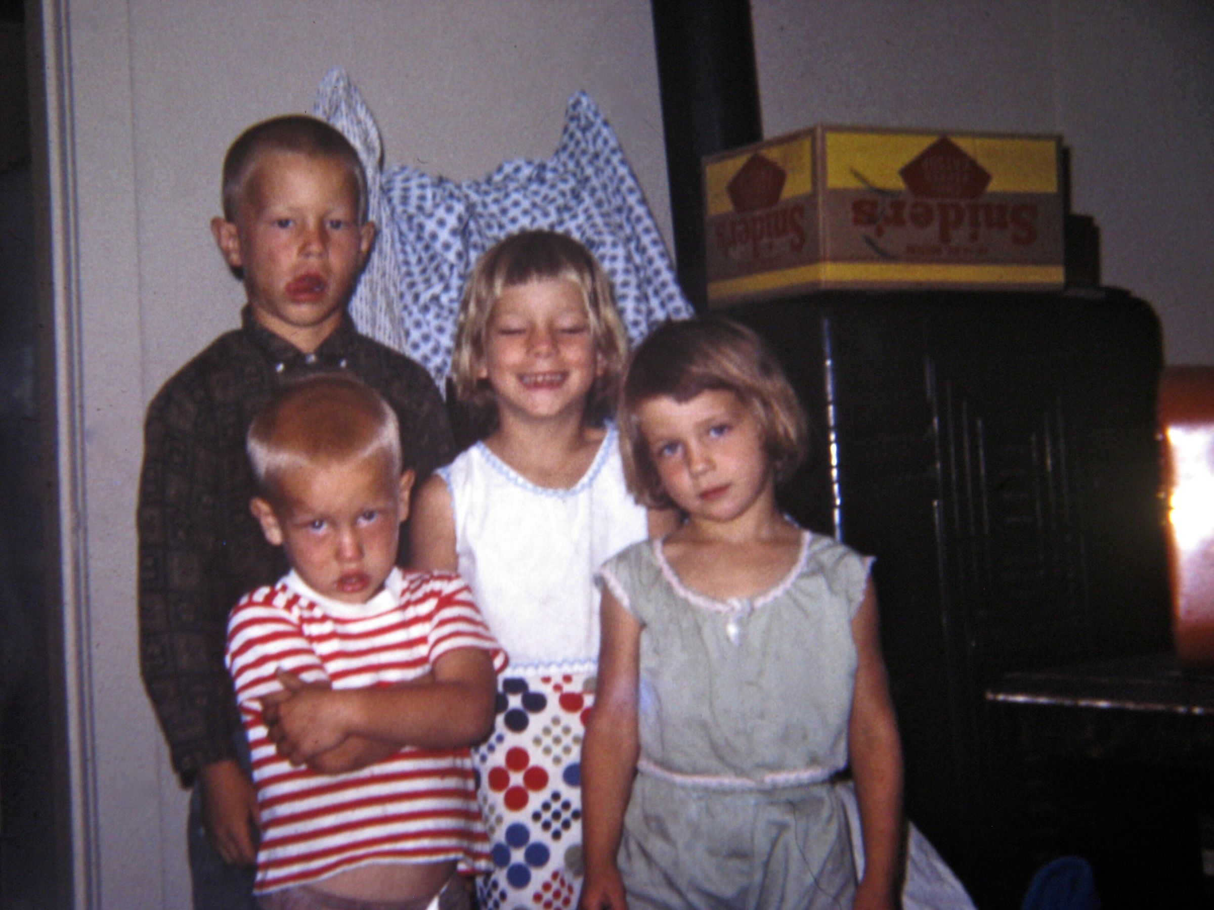 Oldest to youngest; Tom, Mary, Penny, and John Demmin inside home at Horseshoe Bay Farms, unknown date.Photograph Details
