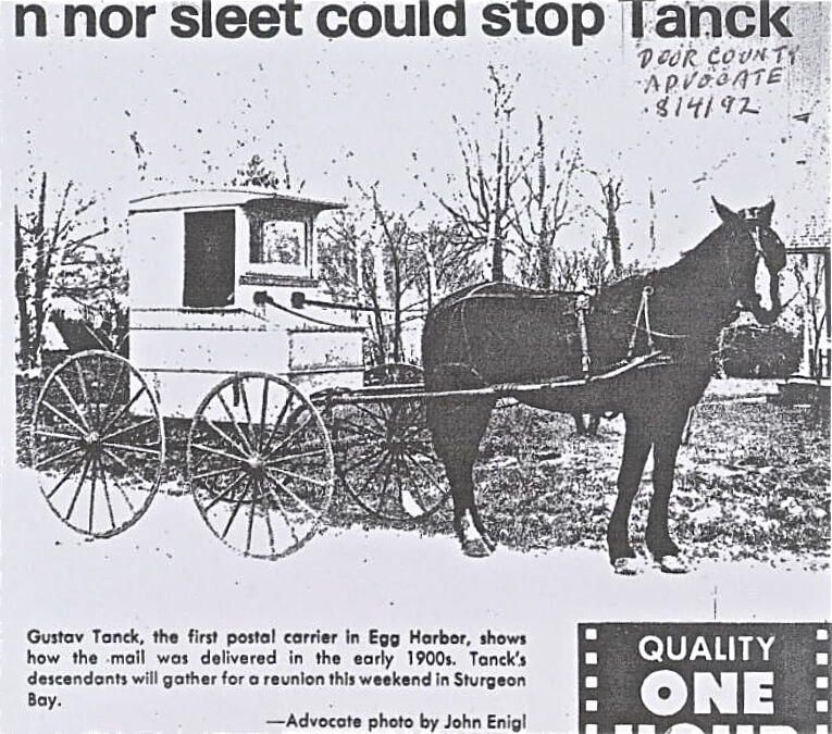Door County Advocate Clipping from August 4th, 1992 detailing Gustav Tanck's accomplishments as the first postal carrier in Egg Harbor.Photograph Details