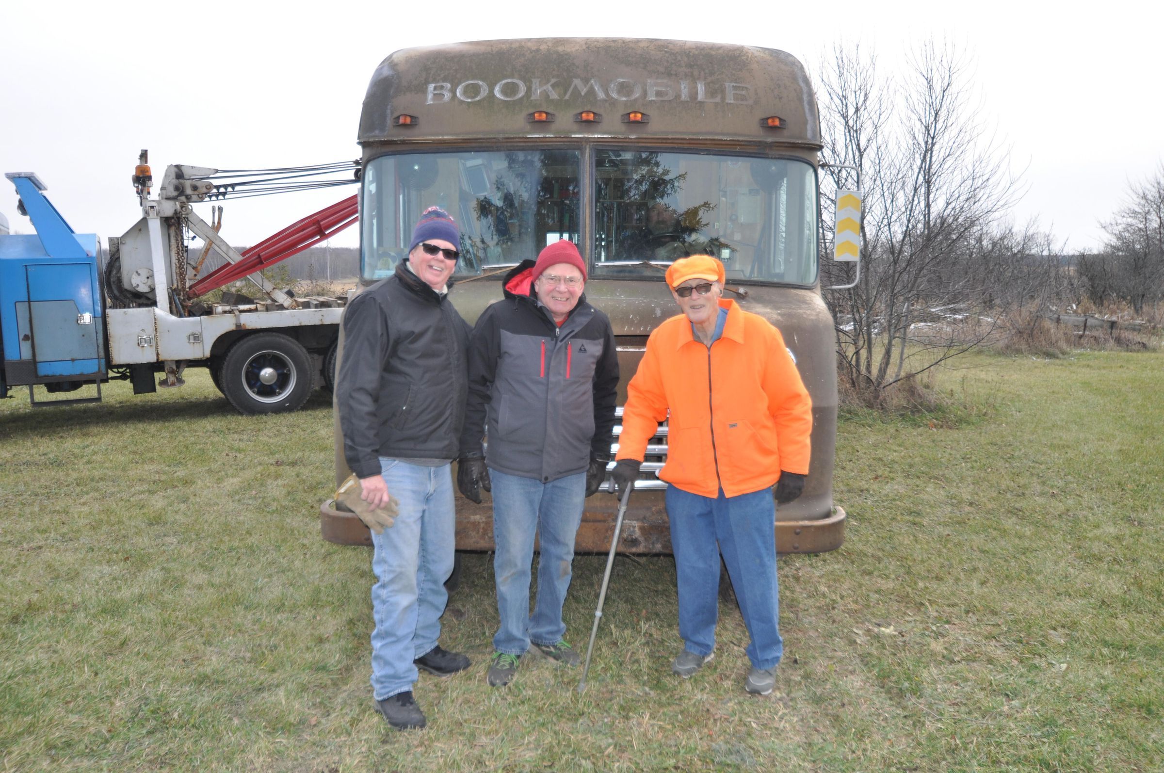 (Lt-Rt) Historical Society President Jim Peterson, V.P. Myles Dannhausen and John Enigl, owner, in the front of the Bookmobile.Photograph Details