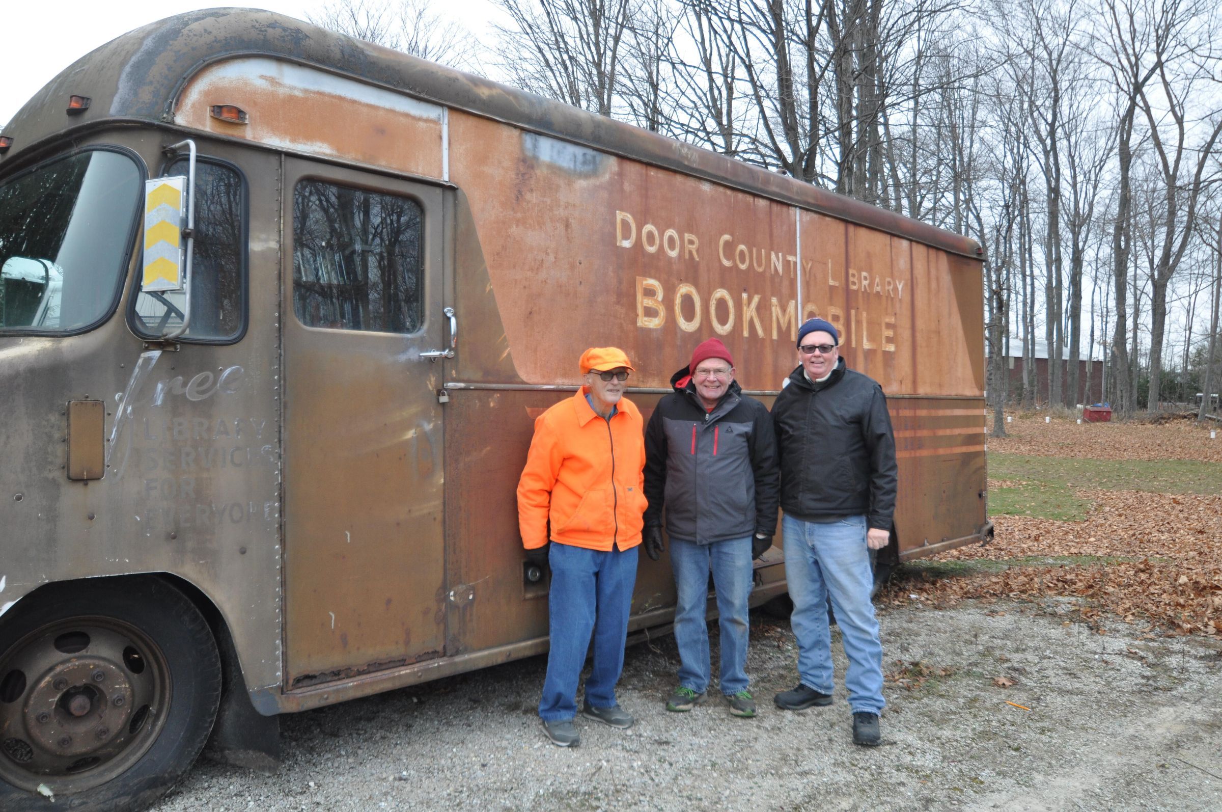 (Lt-Rt). John Enigl, Myles Dannhausen V.P., and Jim Peterson President of the Historical Society on the day of the transfer of the bookmobile to the Historical Society, February 19, 2015.Photograph Details