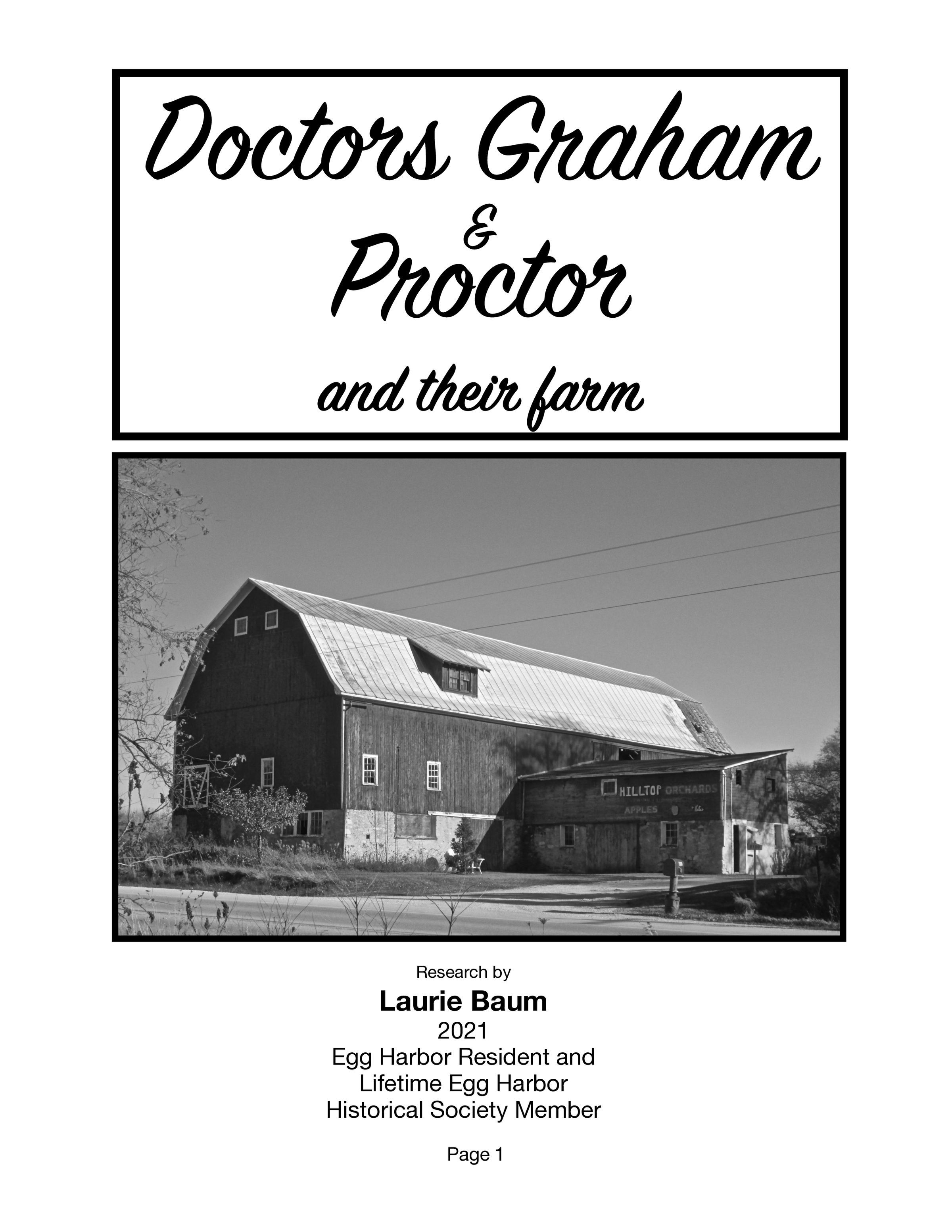 Manuscript telling the story of Egg Harbor doctors Graham and Proctor and their farm. Written by Laurie Baum in 2021. To read the manuscript; (1) click on the cover page, (2) wait for the PDF to be downloaded, (3) if necessary enlarge the image on your screen, and (4) scroll down through the manuscript's pages.Collection