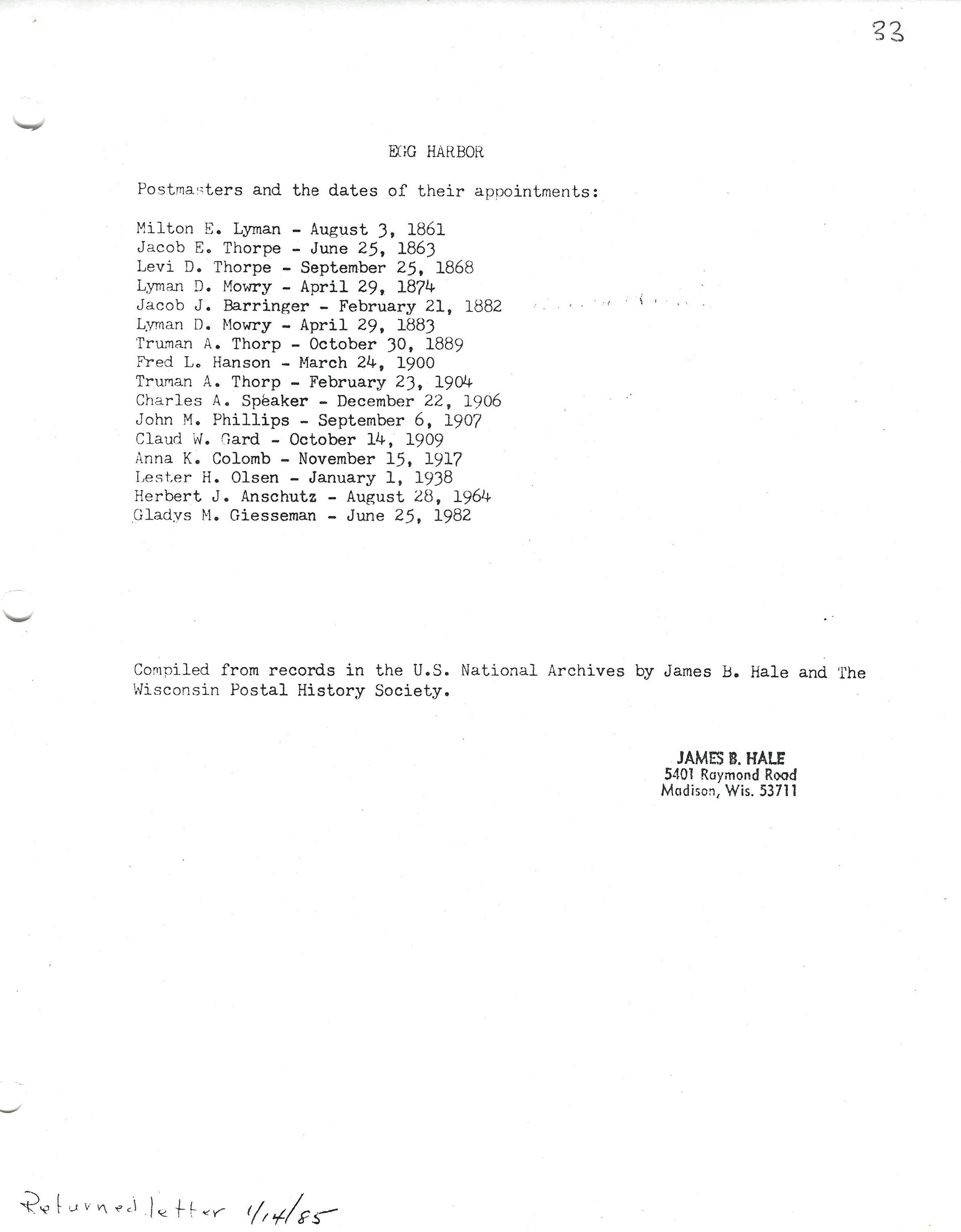 List of Egg Harbor postmasters and their appointments/ dates of service through June 25th, 1982 compiled by James B. HaleCataloged By