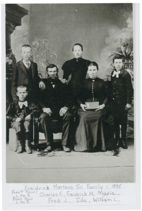 Freidrick Martens Sr. and family as photographed in 1895. The front row from left to right are Charles F., Freidrick M., and Maria. The back row from left to right are Fred J., Ida, and William L.Photograph Details