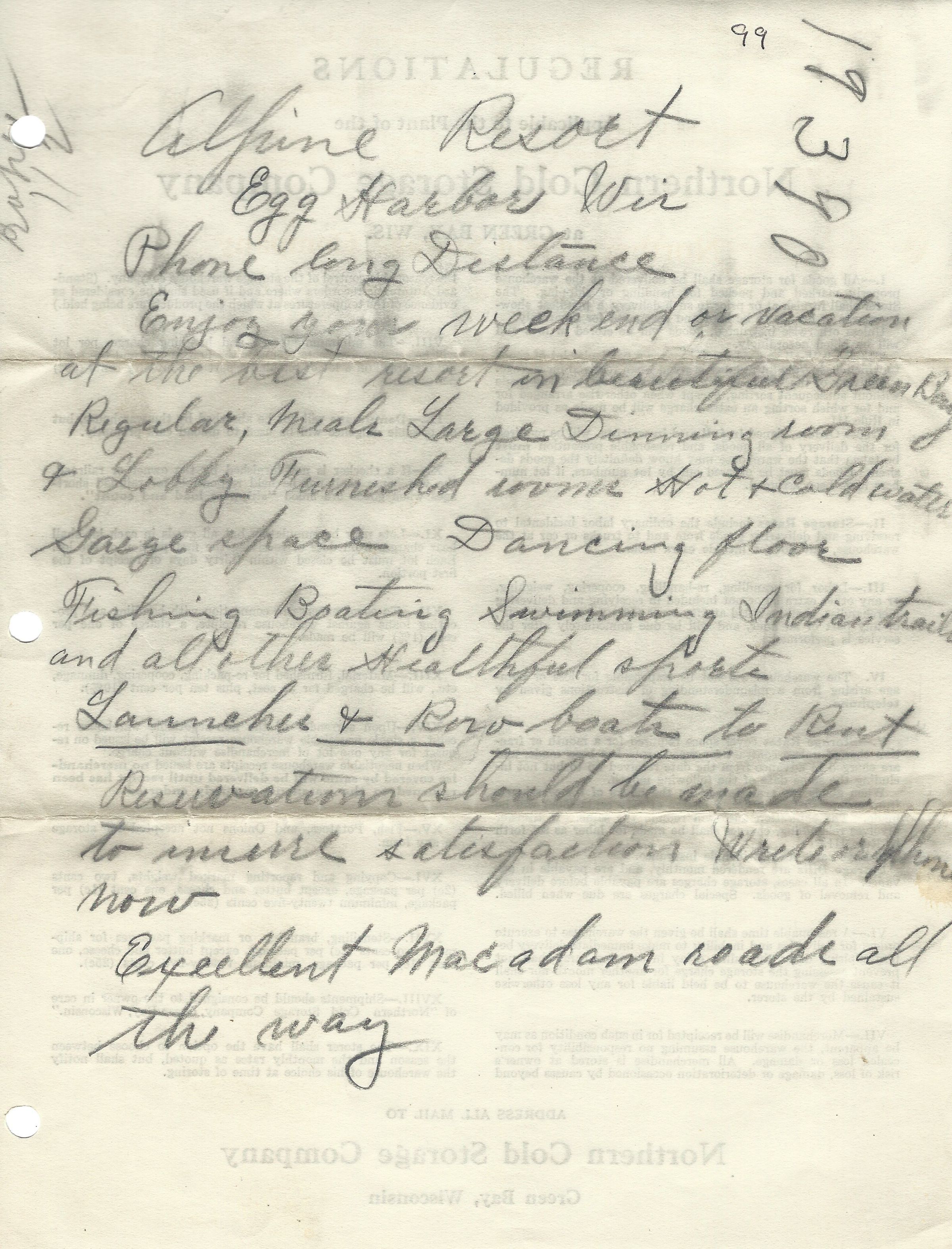 Handwritten description of some of the amenities at the Alpine Resort, unknown date.Photograph Details