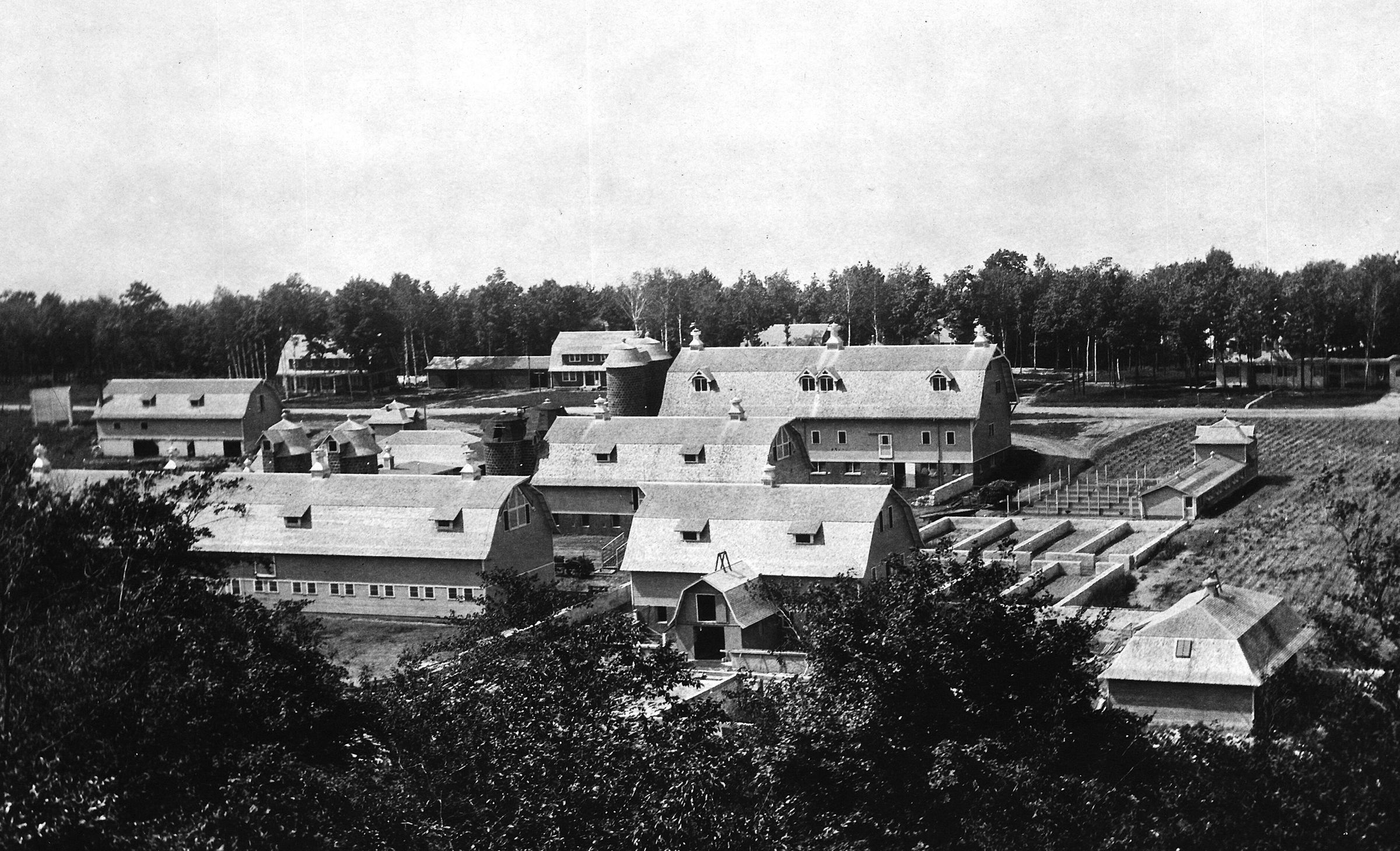A view from the upper bluff level of the farm of the buildings making up the farm housing its cattle, horses, hogs, chickens and turkeys, as well as necessary machinery.Photograph Details
