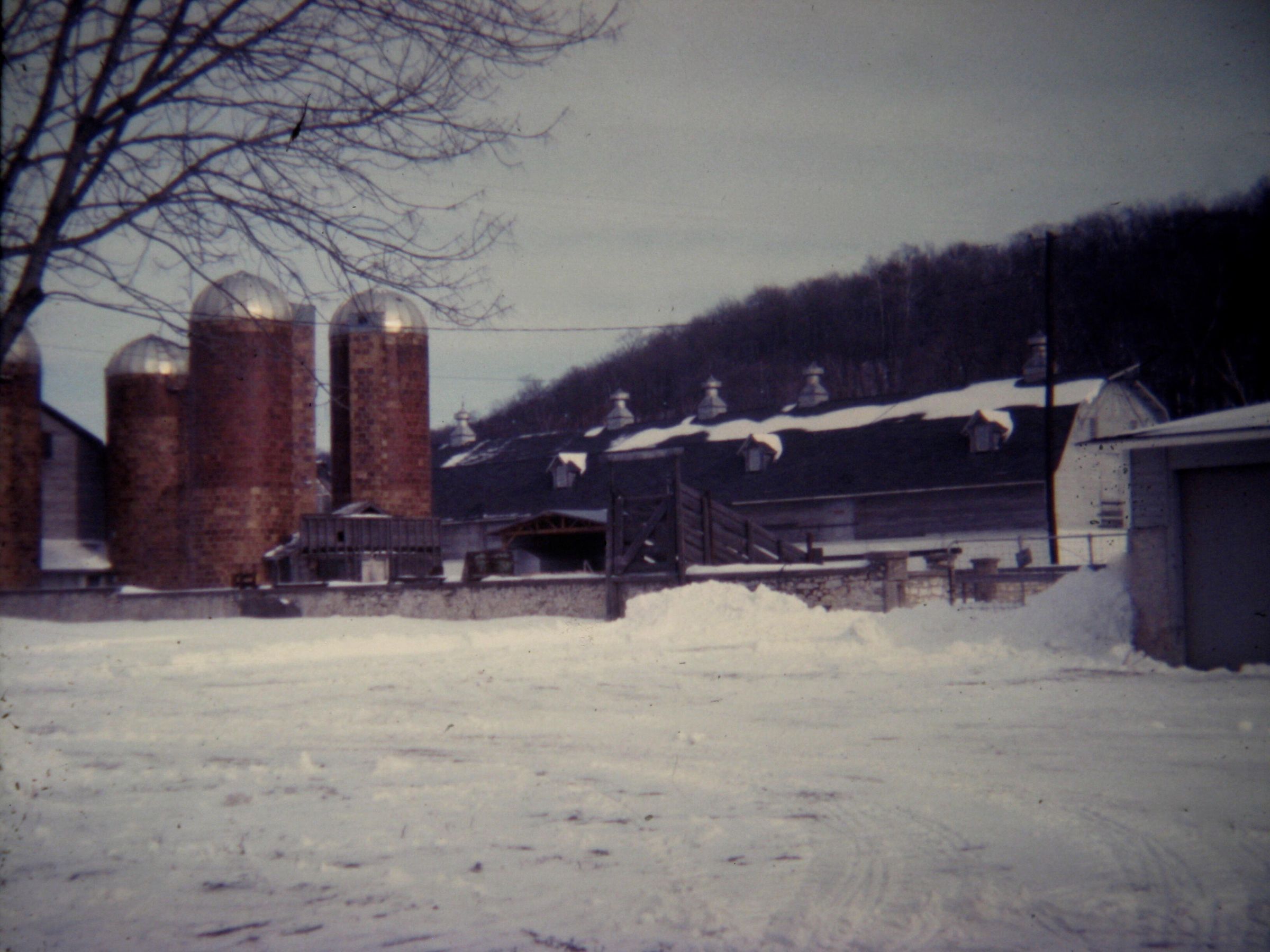 Silos and barns of the Horseshoe Bay Farms in winter, unknown date.Photograph Details
