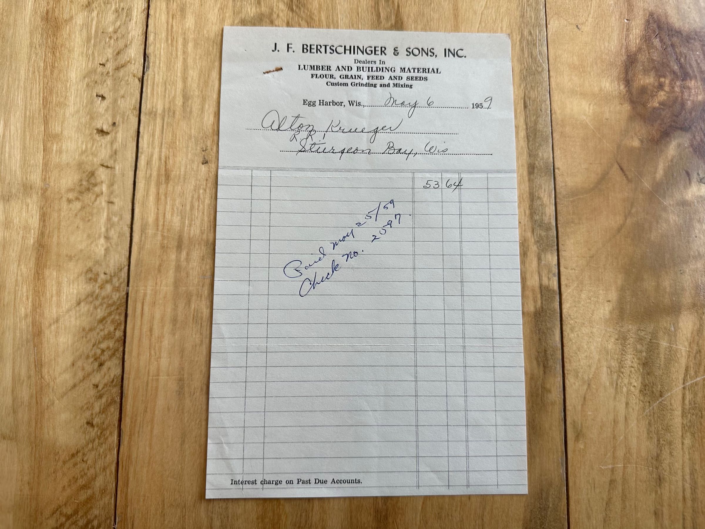 J.F. Bertschinger & Sons, Inc. receipts for lumber prepared for Alton Krueger in March and May of 1959.Cataloged By