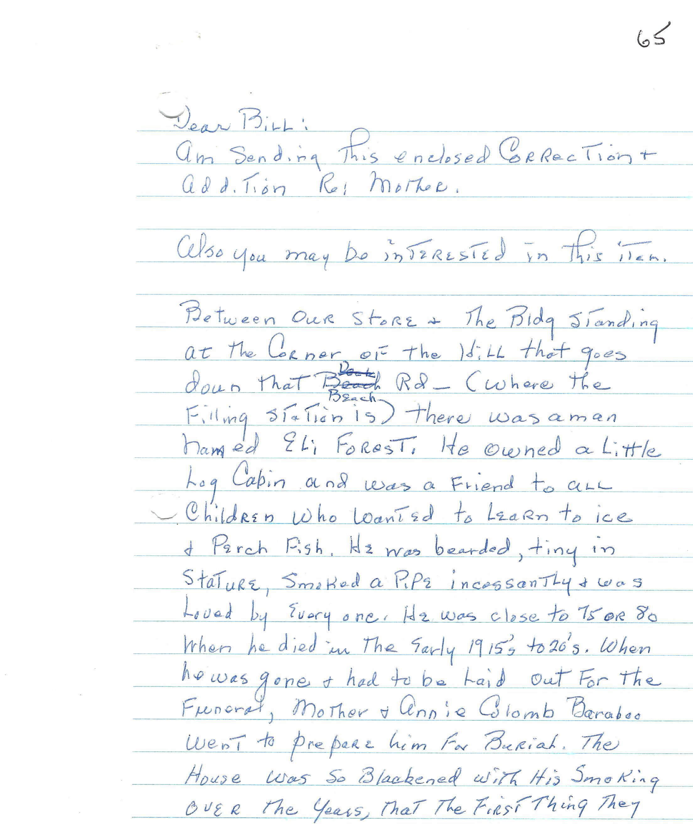 Elva Wilson relates stories and facts about her own family and other notable early Egg Harbor citizens in a letter to Bill Bertschinger. Unknown date.Created By