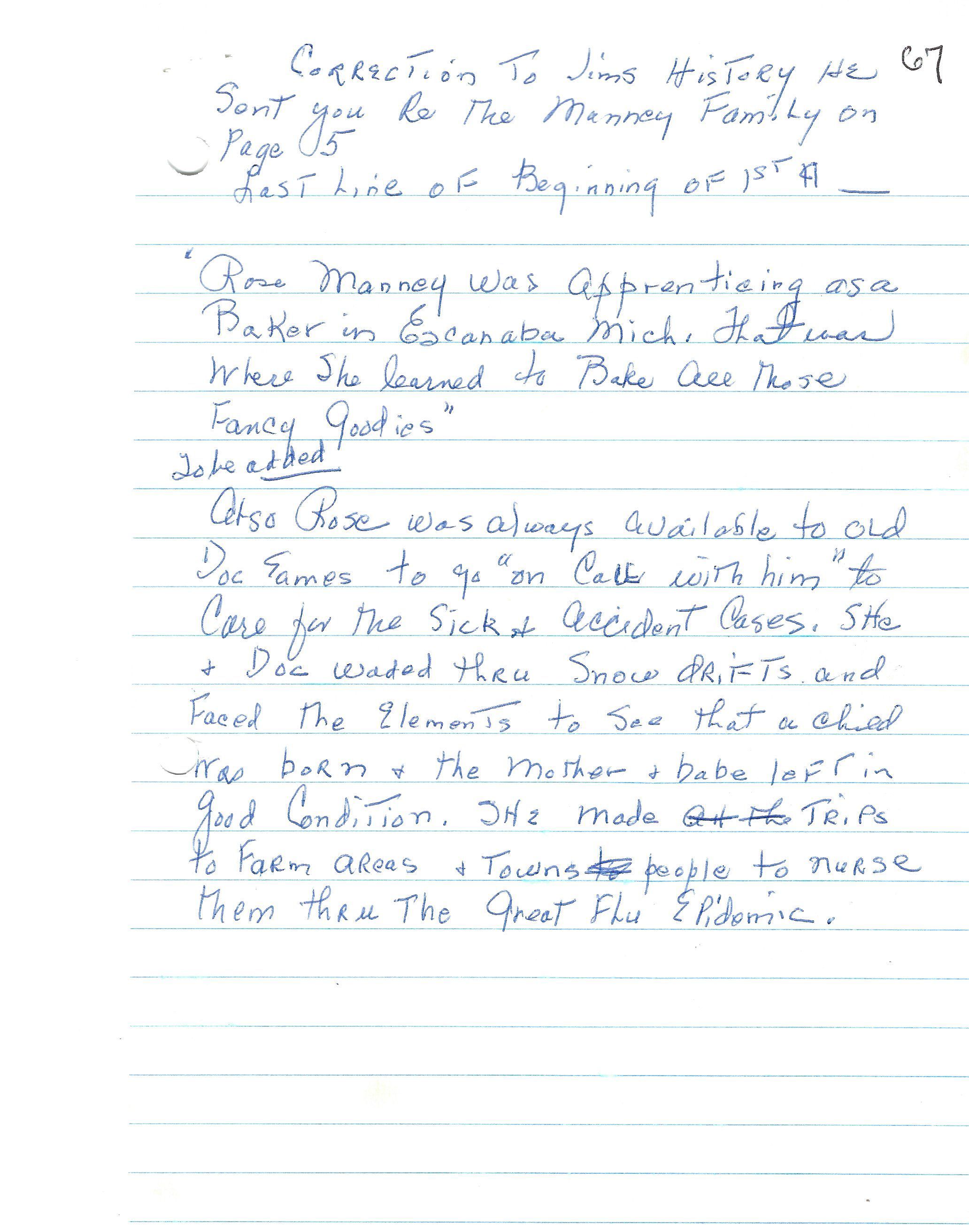 Handwritten correction to Manney Family History, unknown date.Cataloged By