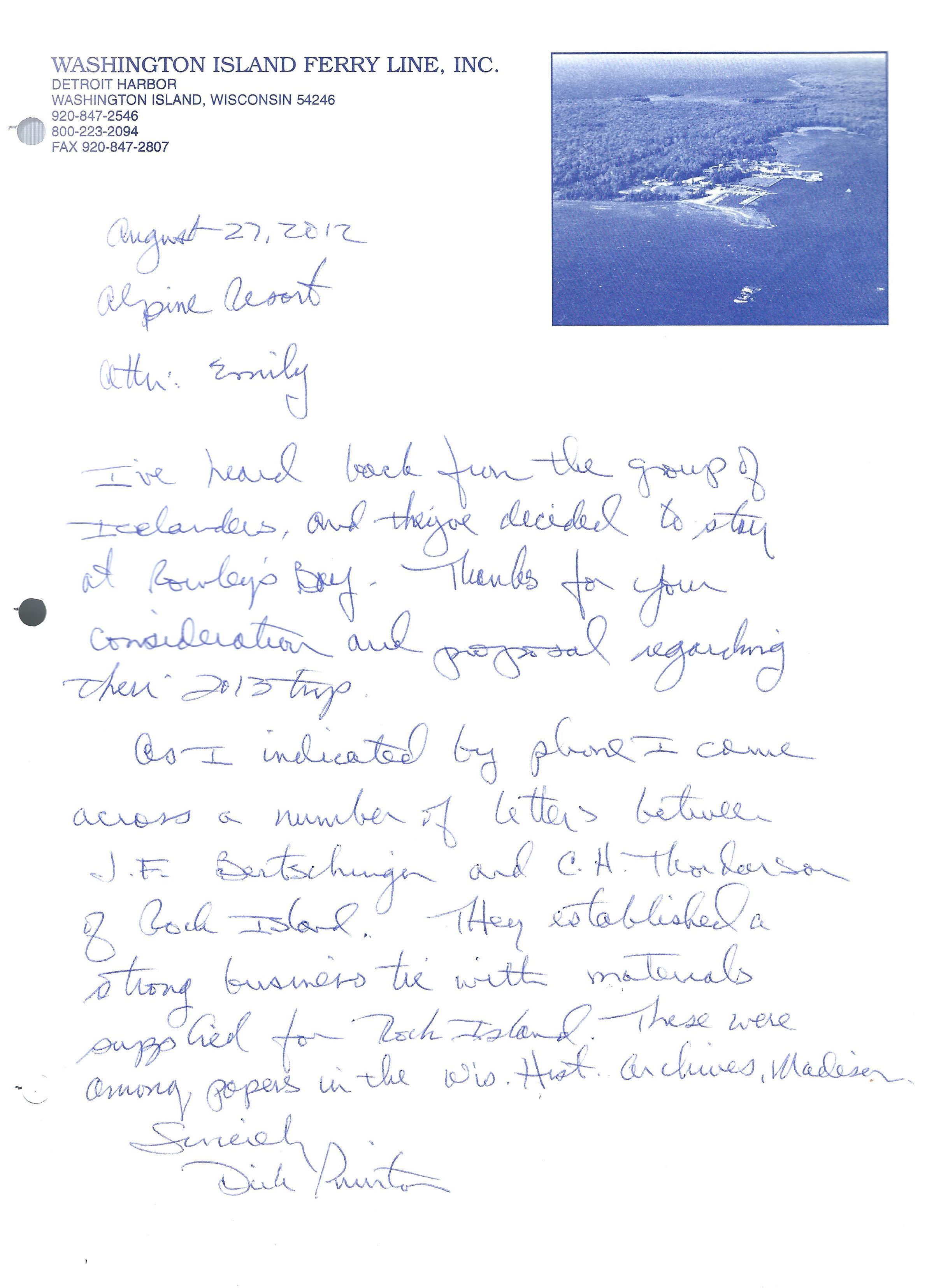 Memo from an employee of the Washington Island Ferry Line to an employee at the Alpine Resort in 2012 discussing the discovery of John Bertschinger's letters with C.H. Thordarson.Photograph Details