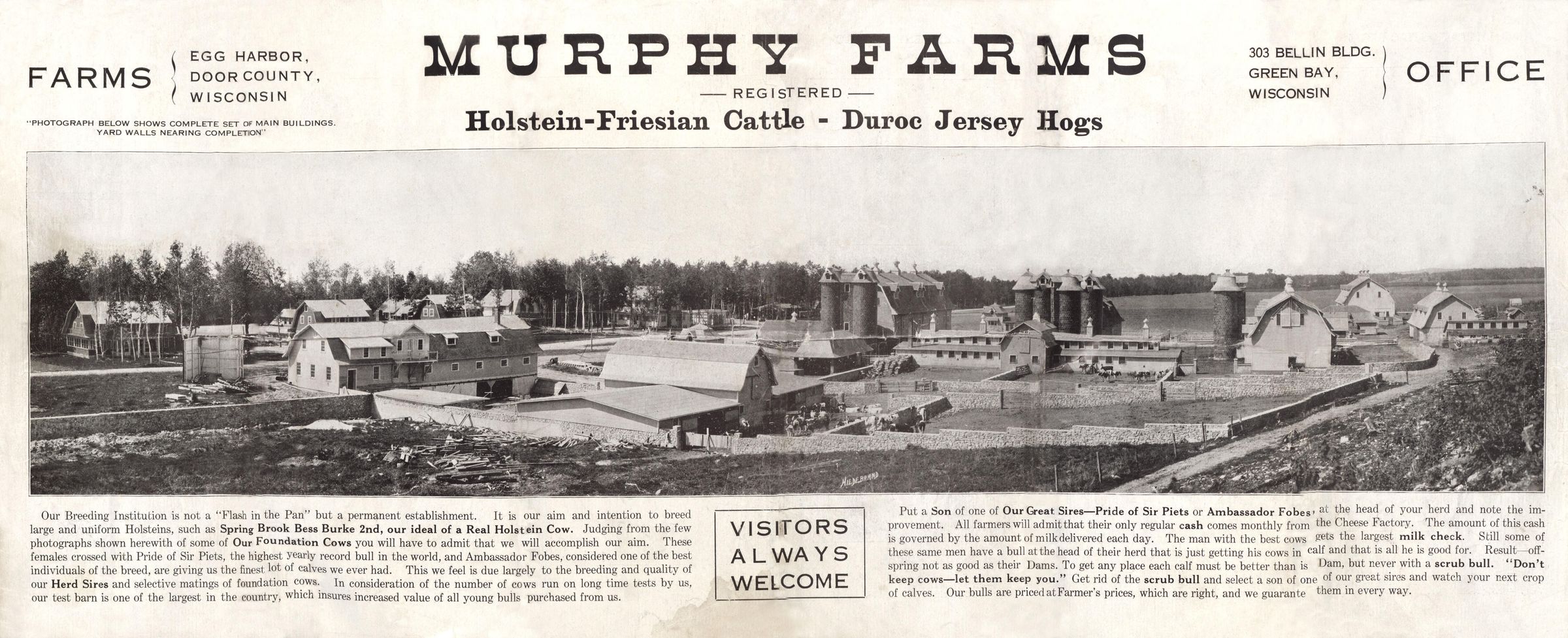 Paper Advertisement showing panorama image of all main buildings at the then-named Murphy Farms including address and detailed description of general operations. Advertisement encourages visitors to the farm, and boasts of the farm's famous Holstein-Friesian Cattle and Duroc Jersey Hogs.Collection