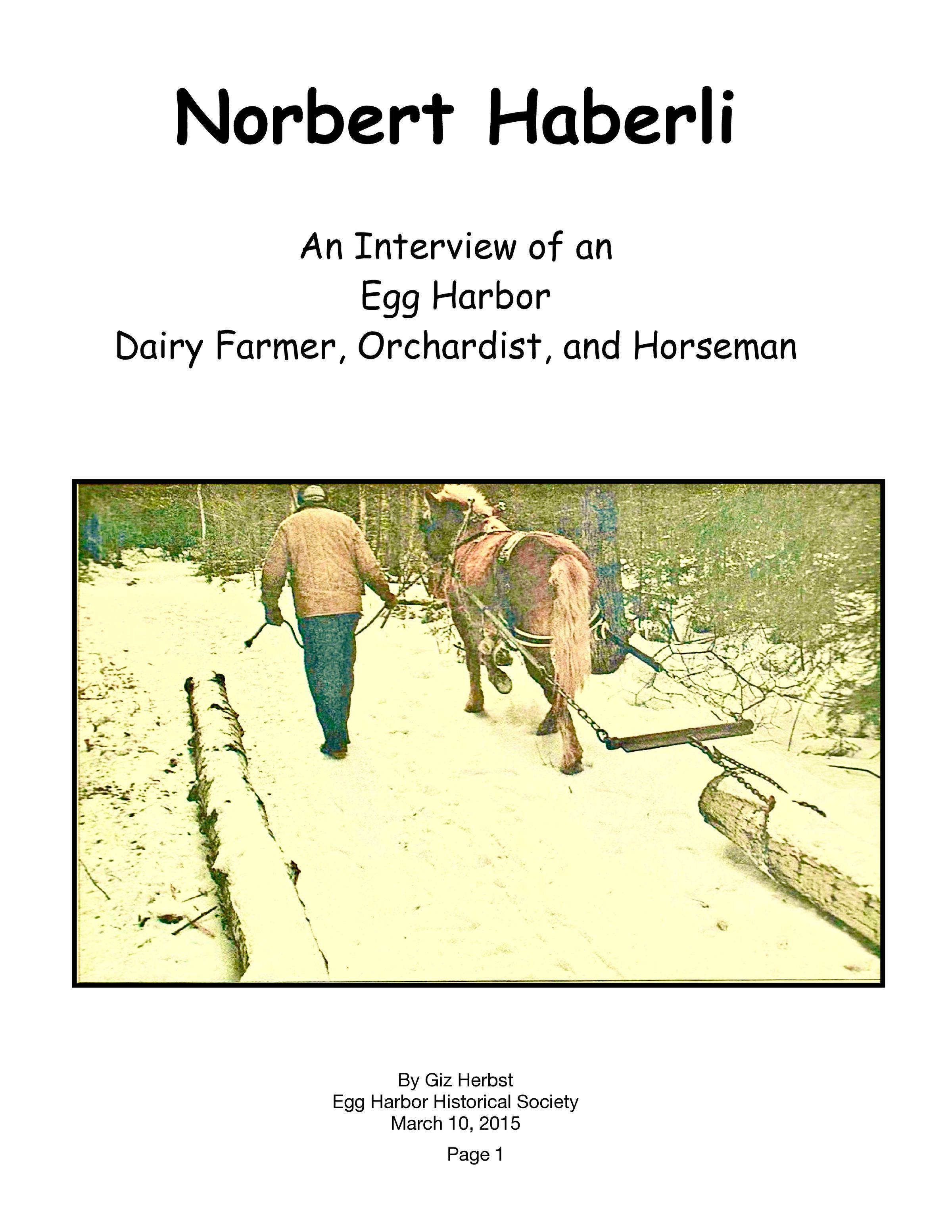An interview with Norbert Haberli, a dairy farmer, orchardist, and horseman who lived in Egg Harbor. To read the manuscript; (1) click on the cover page, (2) wait for the PDF to be downloaded, (3) if necessary enlarge the image on your screen, and (4) scroll down through the manuscript's pages.Collection