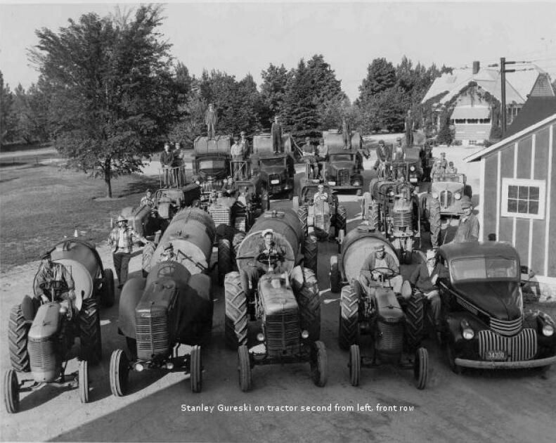 Group of men on tractors pulling spray equipment for Reynolds Orchards. Stanley Gureski is on tractor second from left, front row. Other men, location, and date unknown.Photograph Details