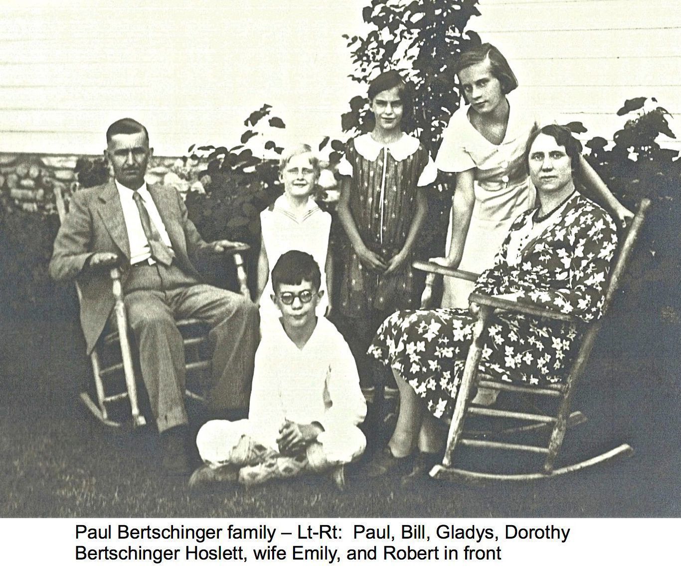 Photo caption reads: "Paul Bertschinger family- Lt.-Rt.: Paul, Bill, Gladys, Dorothy Bertschinger Hoslett, wife Emily, and Robert in front." Unknown Date.Cataloged By