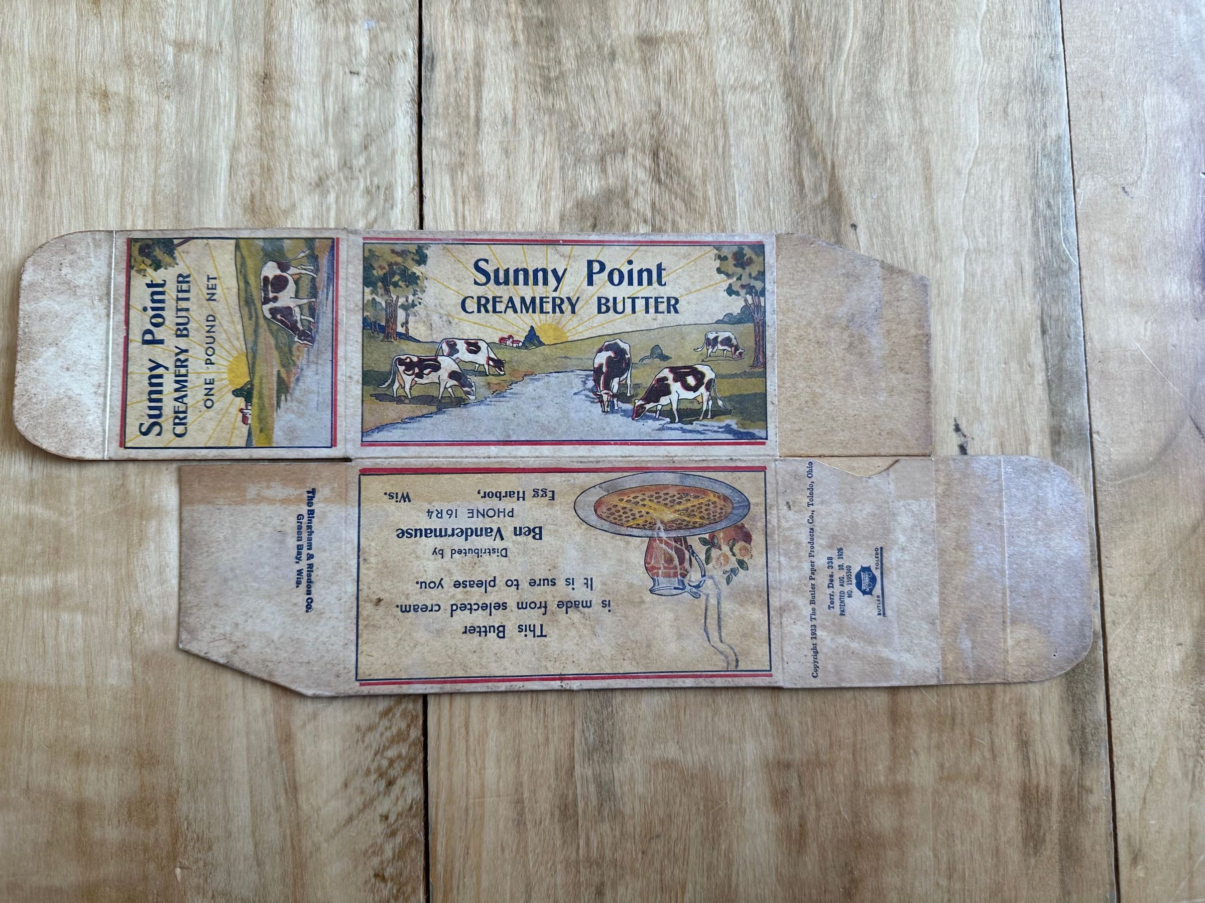 Packaging for one pound of butter from Sunny Point Creamery. One side identifies the distributer as Ben Vandermause, Phone 16R4, in Egg Harbor, WI. Unknown date on specific butter packaging but copyright from The Butler Paper Products Co., Toledo, Ohio, is 1933.Cataloged By
