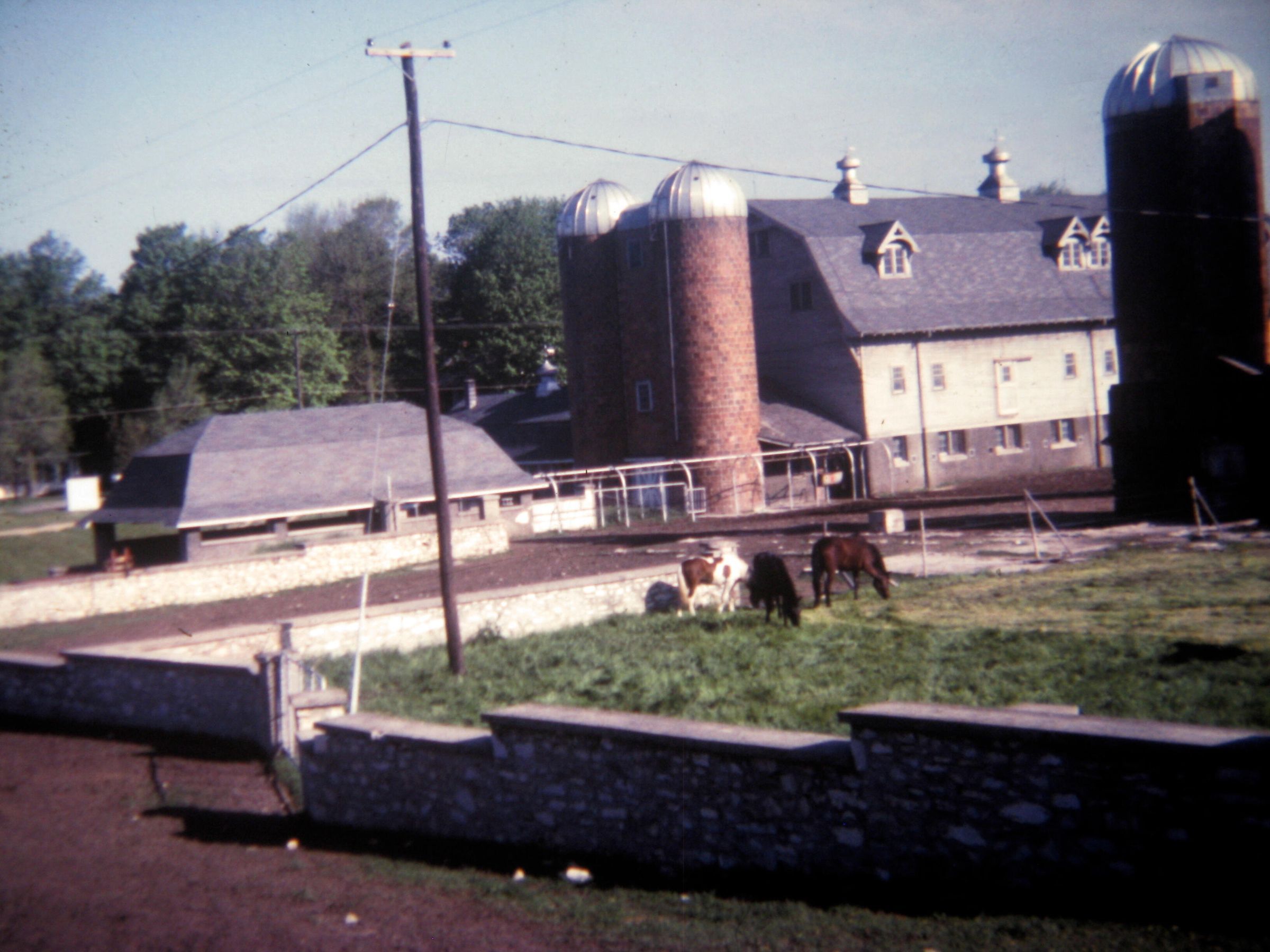 Horses graze in a paddock near one of Horseshoe Bay Farms' barns, unknown date.Photograph Details