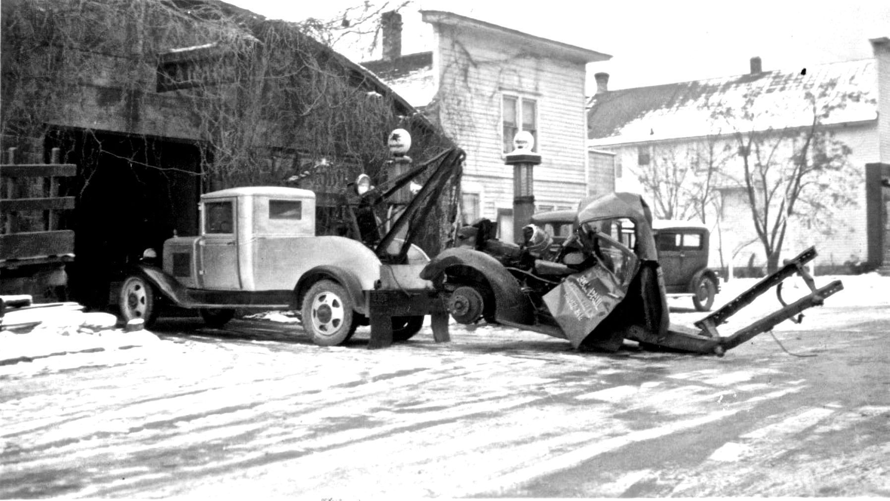 Wrecked Car Being Towed Into Birnschein Garage.Description