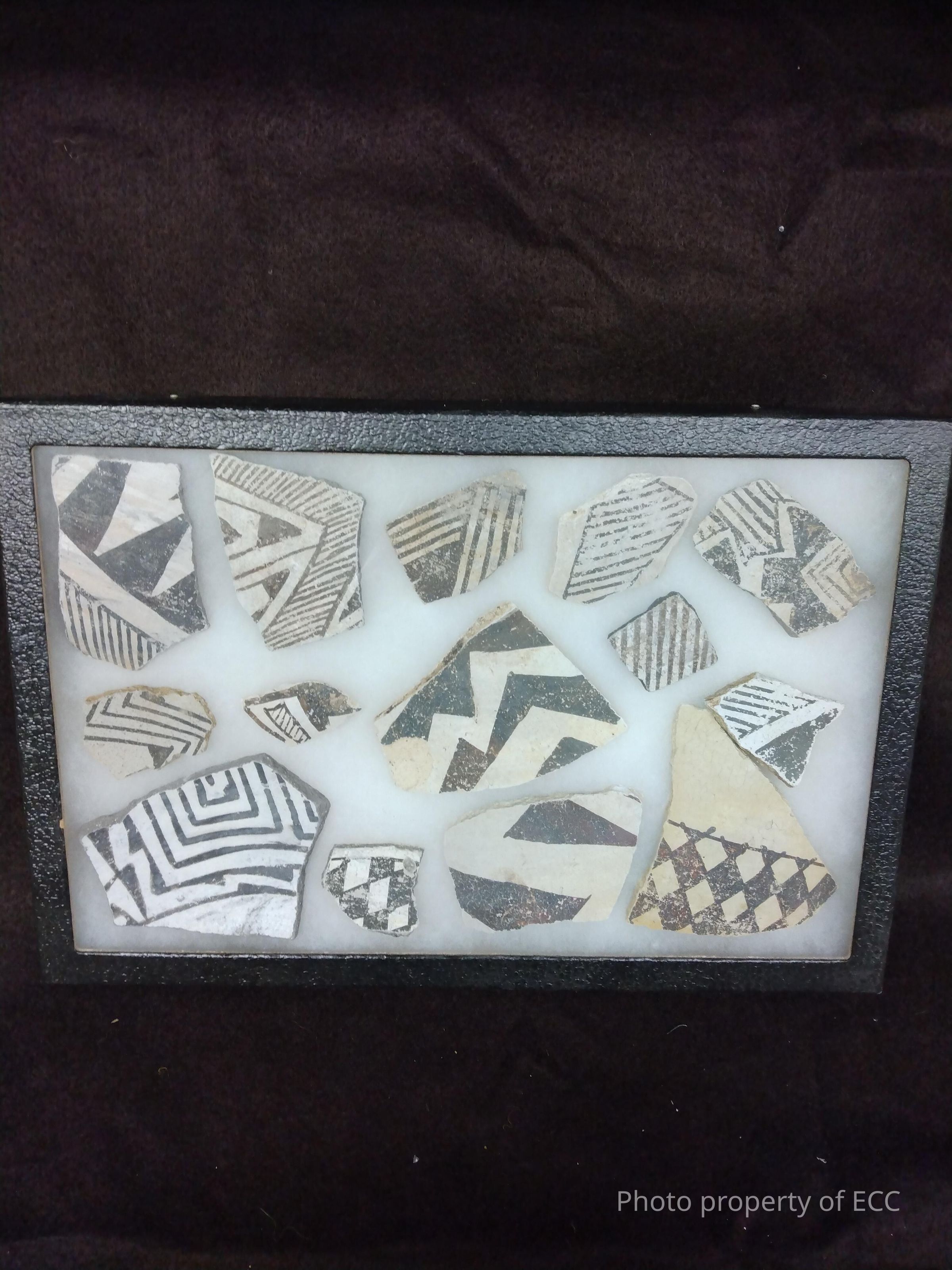 A specimen box with fourteen shards. All the shards are white with a black geometric design.Collection