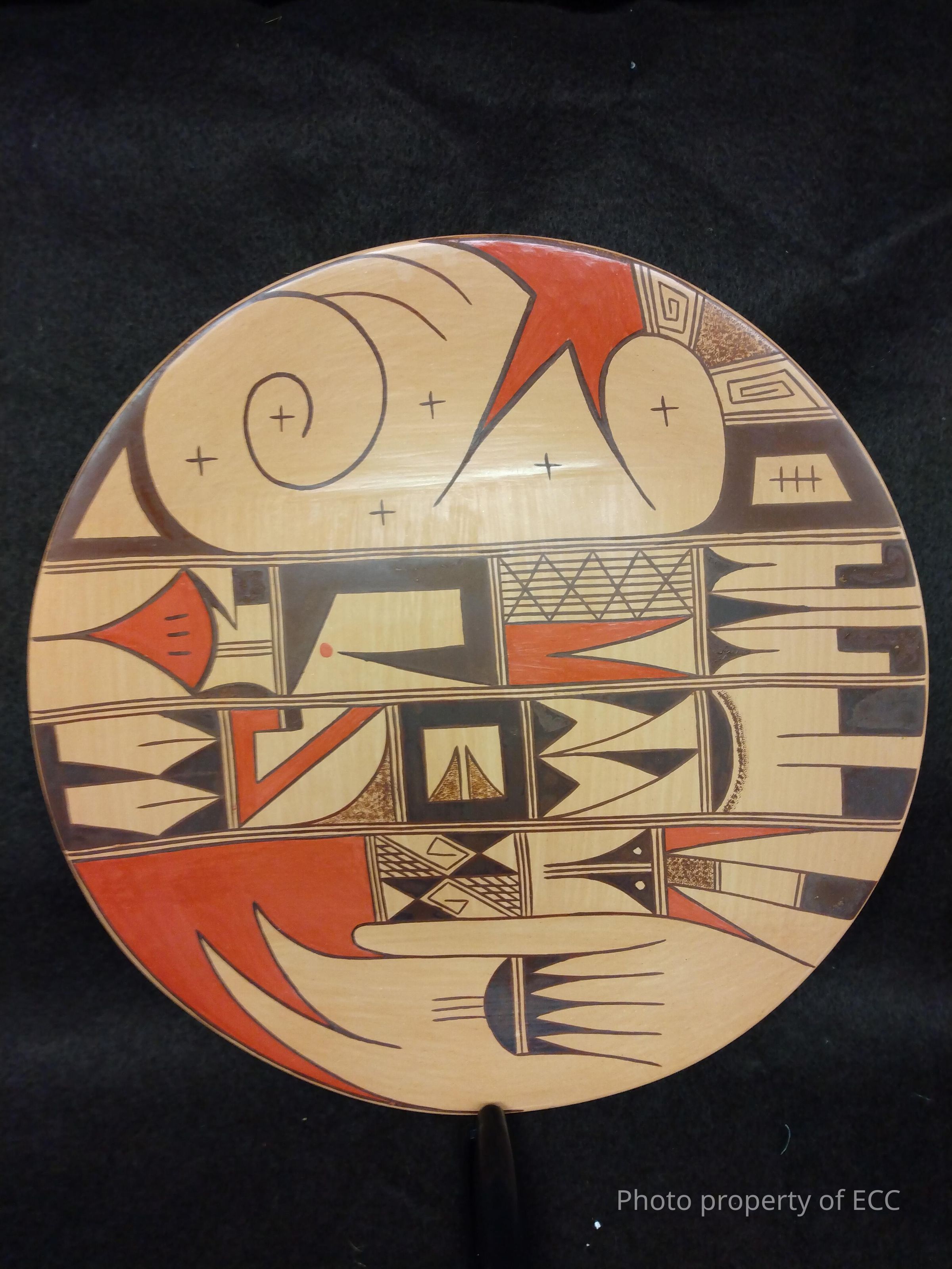 A polychrome plate with a painted geometric design. The plate was handmade via coil and scrape method, using native clay and pigment. It was created by Fannie L. Polacca in 2002, and has a signature on the back.Collection