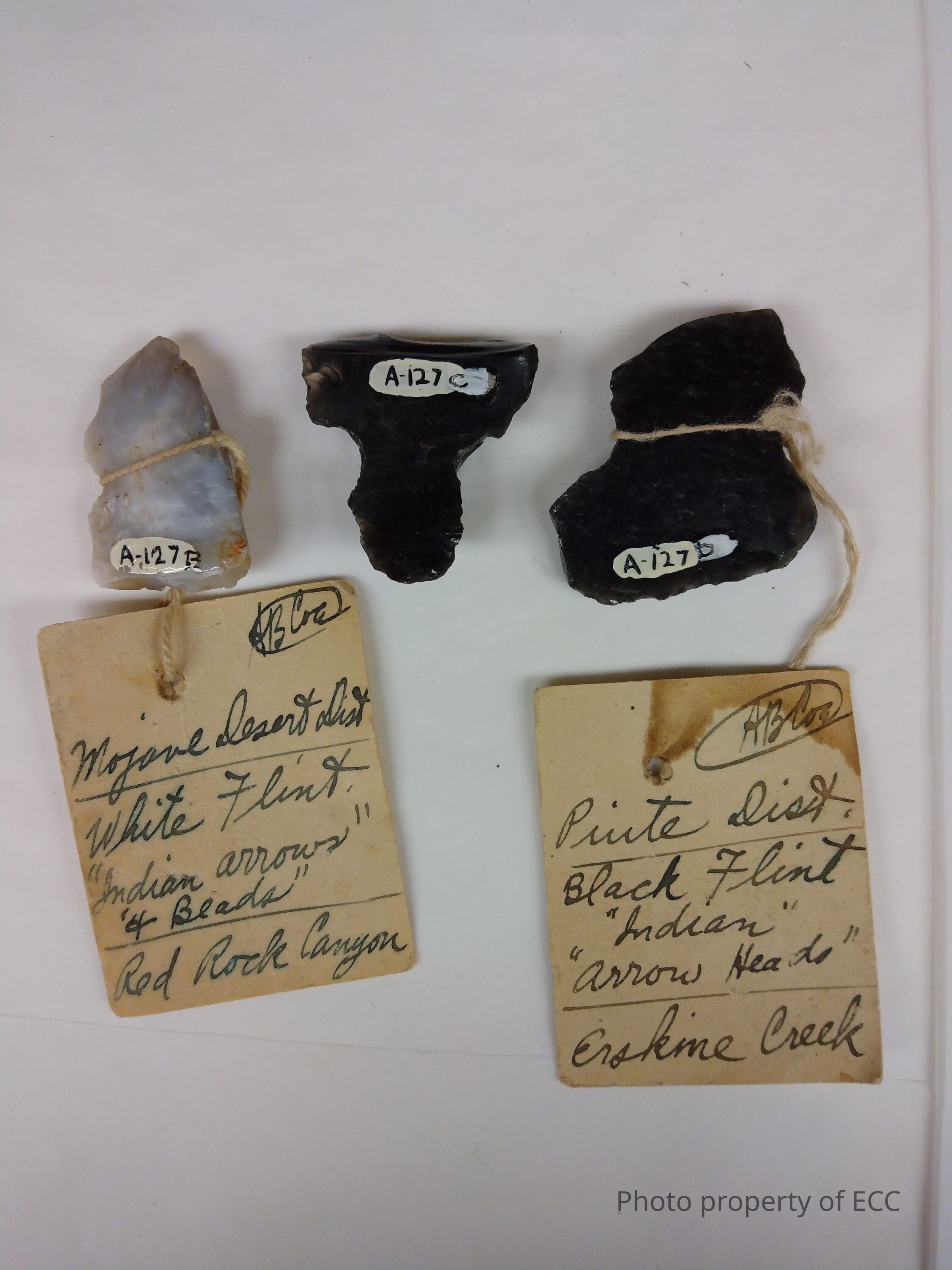 A is missing. B has tag labeling it as white flint from the Mojave Desert, Red Rock Canyon. D has worn string tied around it; tag is loose and reads as Black flint from Erskine Creek.Ethnography
