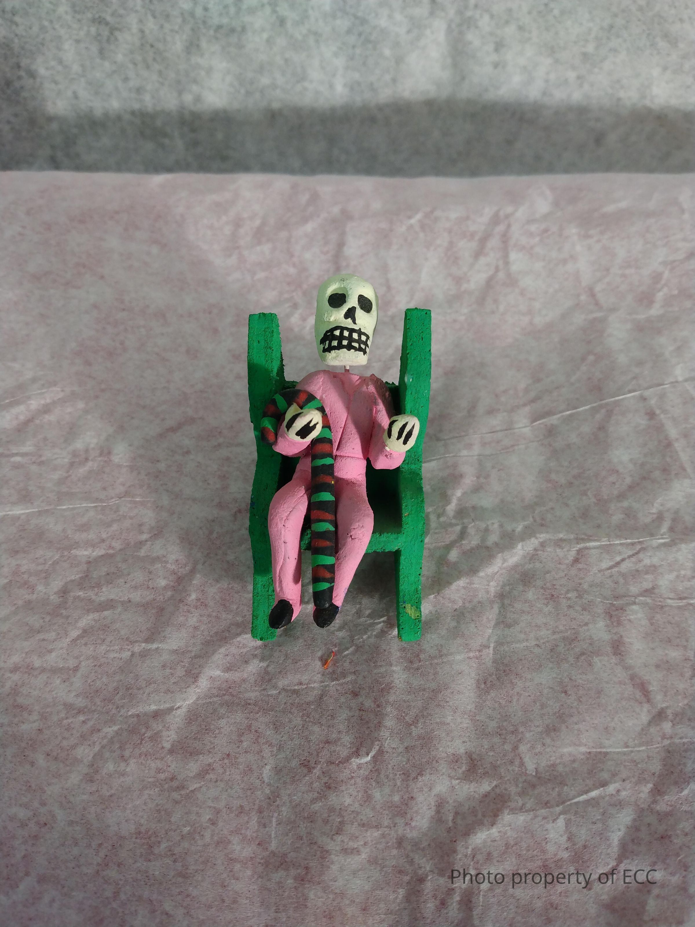 A miniature depicting a skeleton man in a rocking chair, holding a chain. Made of wood and clay, the skeleton wears a pink suit, while holding a black cane with red and green stripes. His chair is green, and does not rock, despite looking like a rocking chair.Collection