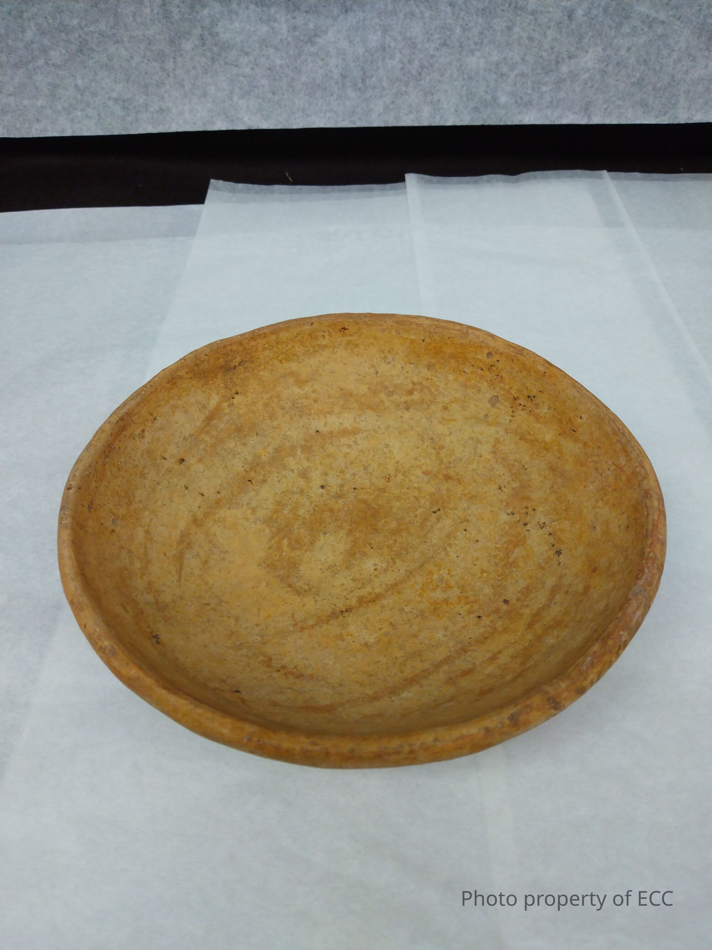 A small round bowl, tan and brown in color. With some orange red colored clay on the bottom of the bowl. Various small nicks and chips around the lip with one long crack running from lip to almost middle of bowl.Collection