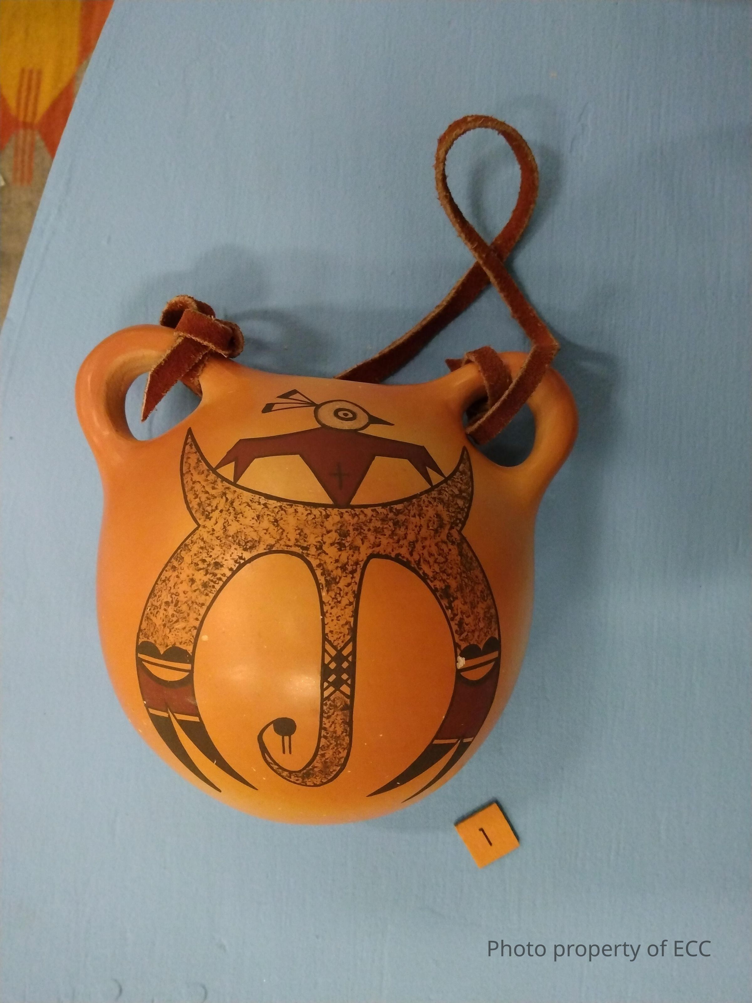 A buff polychrome canteen painted with a stylized bird design with a black outline and red, black, and white paint. The canteen was handmade via the coil and crape method using native clay. Two lugs on the canteen provide handles for a leather strap. Signed on the back is: "Dorothy Ami, 2001, Tewa Hopi" as well as a image of a pipe and smoke.Collection