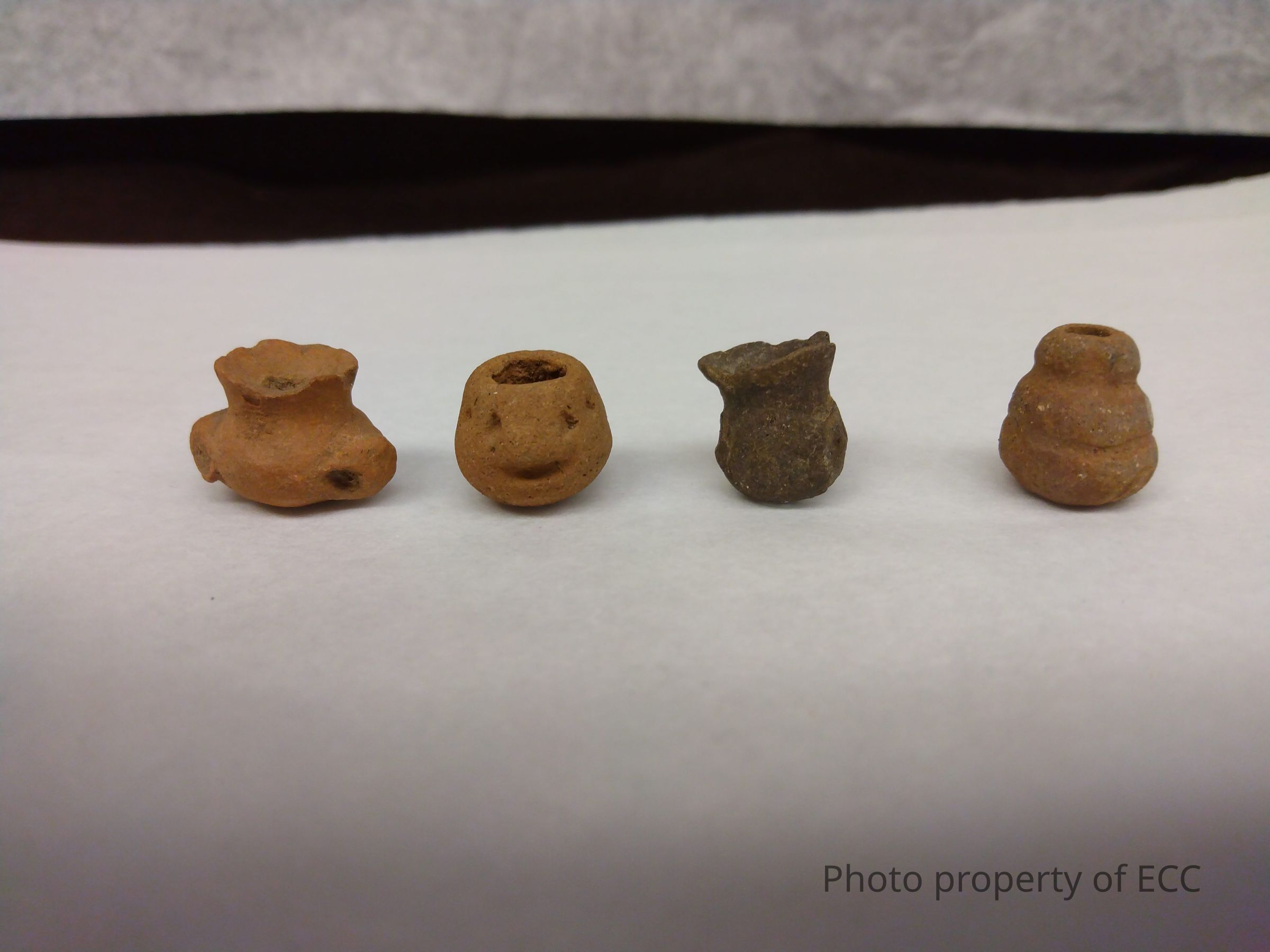 690 A: has 2 small lobes with holes, a raised neck and a wide lip. Lip is chipped completely around but is still in good condition. Brown in color