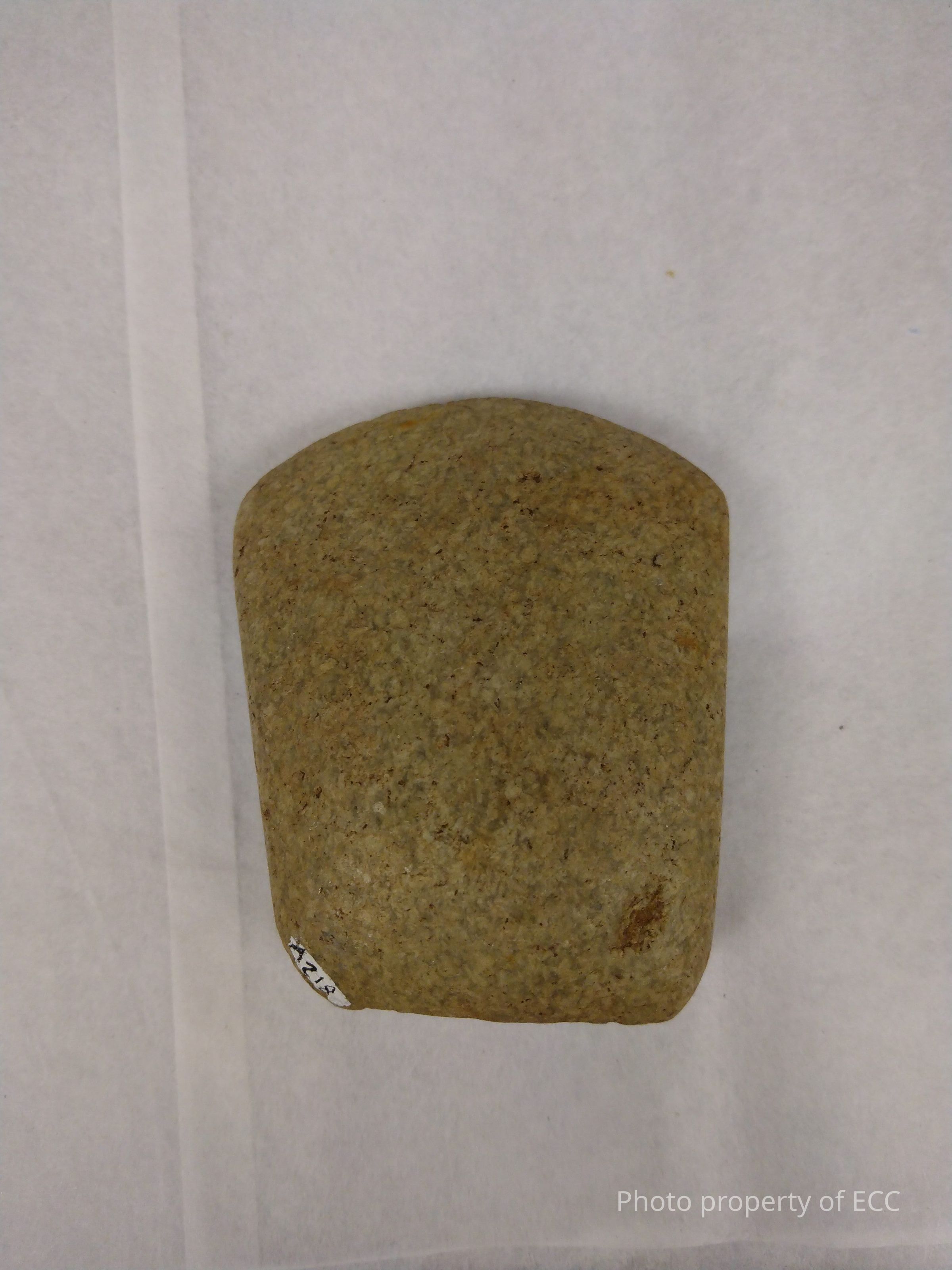 Small stone axe head light brown in color. Almost entirely intact with light grinding marks along the blade. small chip on the top corner of the rear section.Collection