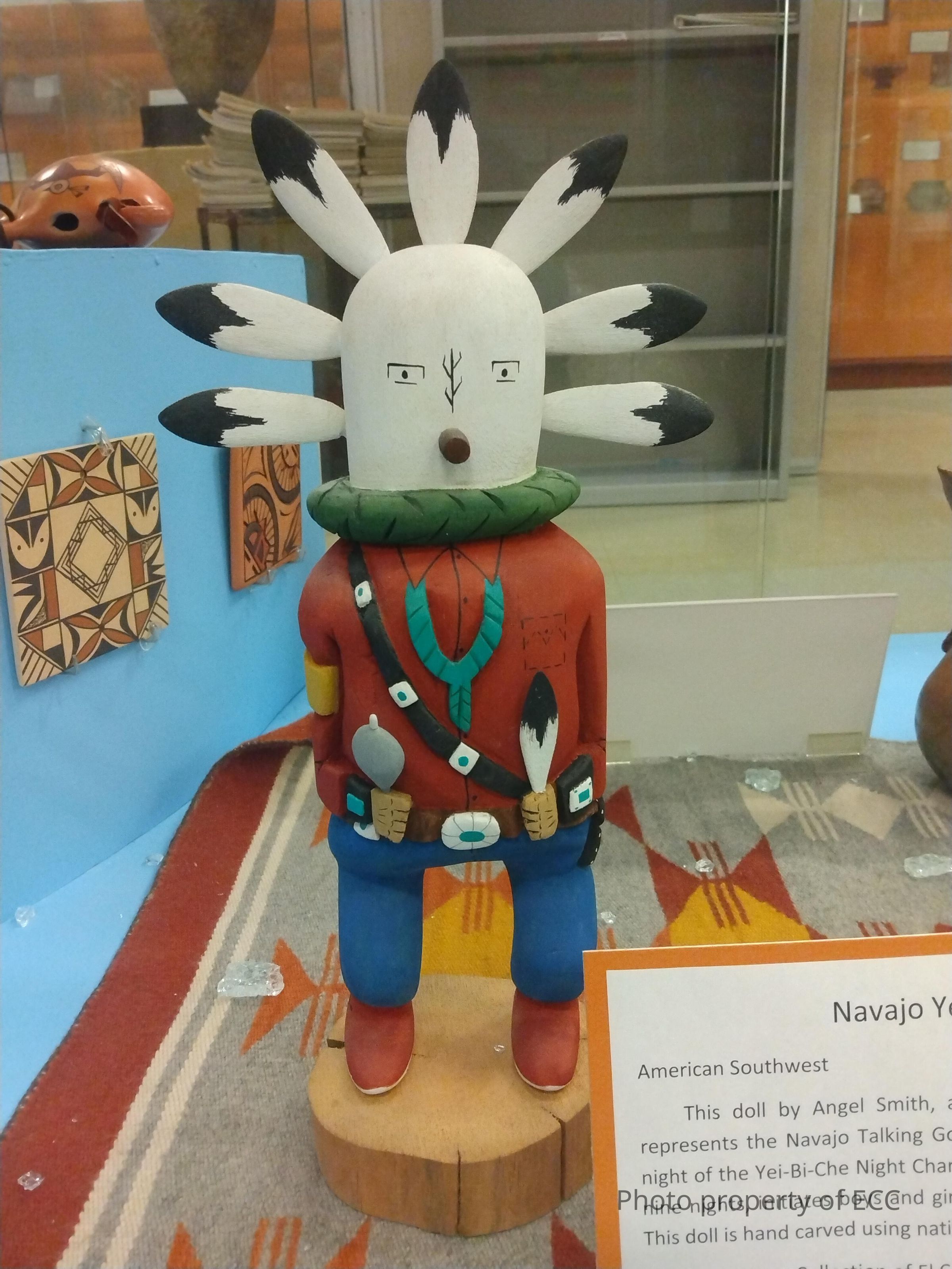 A Yei-Bi-Che doll created by Angel Smith. It was hand carved using native cottonwood root. The figure has red shoes, blue pants, and a red shirt. The figure also has a belt on that holds some items including a feather. Around the figures neck is a green collar. The face of the figure is all white with black markings for the eyes and a design between them. Around the figure's head are seven feathers. The bottom is signed "A.Smith"Collection