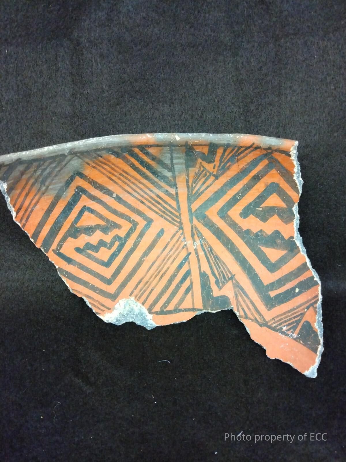 A pot shard with a red interior with a black triangle motif. The exterior of the shard is terracotta with a whit geometric design.Collection