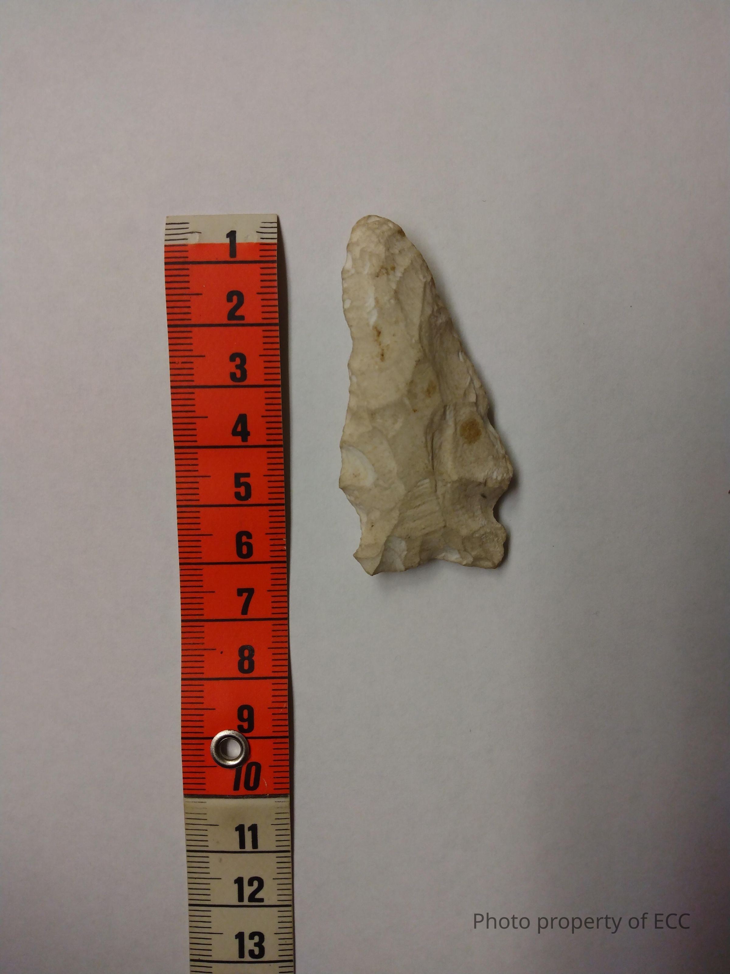 Chert projectile point. Out flaring ears formed by side notching, well worked concave baseContext
