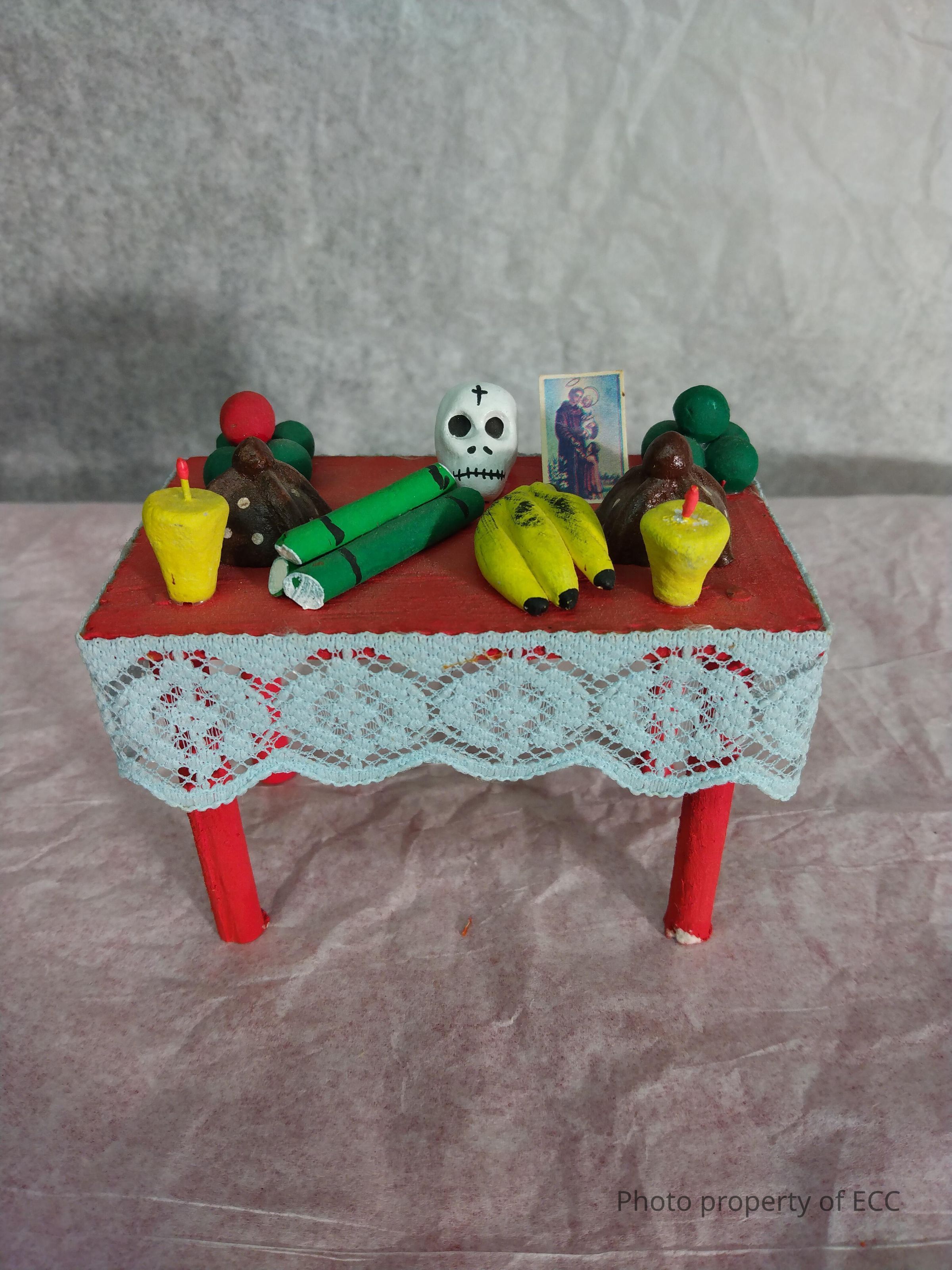 A miniature red ofrenda table with various food offerings. A white skull, miniature picture of Saint Joseph and baby Christ, also sit on a the table, along with two yellow candles on either side of the front of the table. Around the edges of the table is a piece of blue lace, to give the impression of a table cloth.Collection