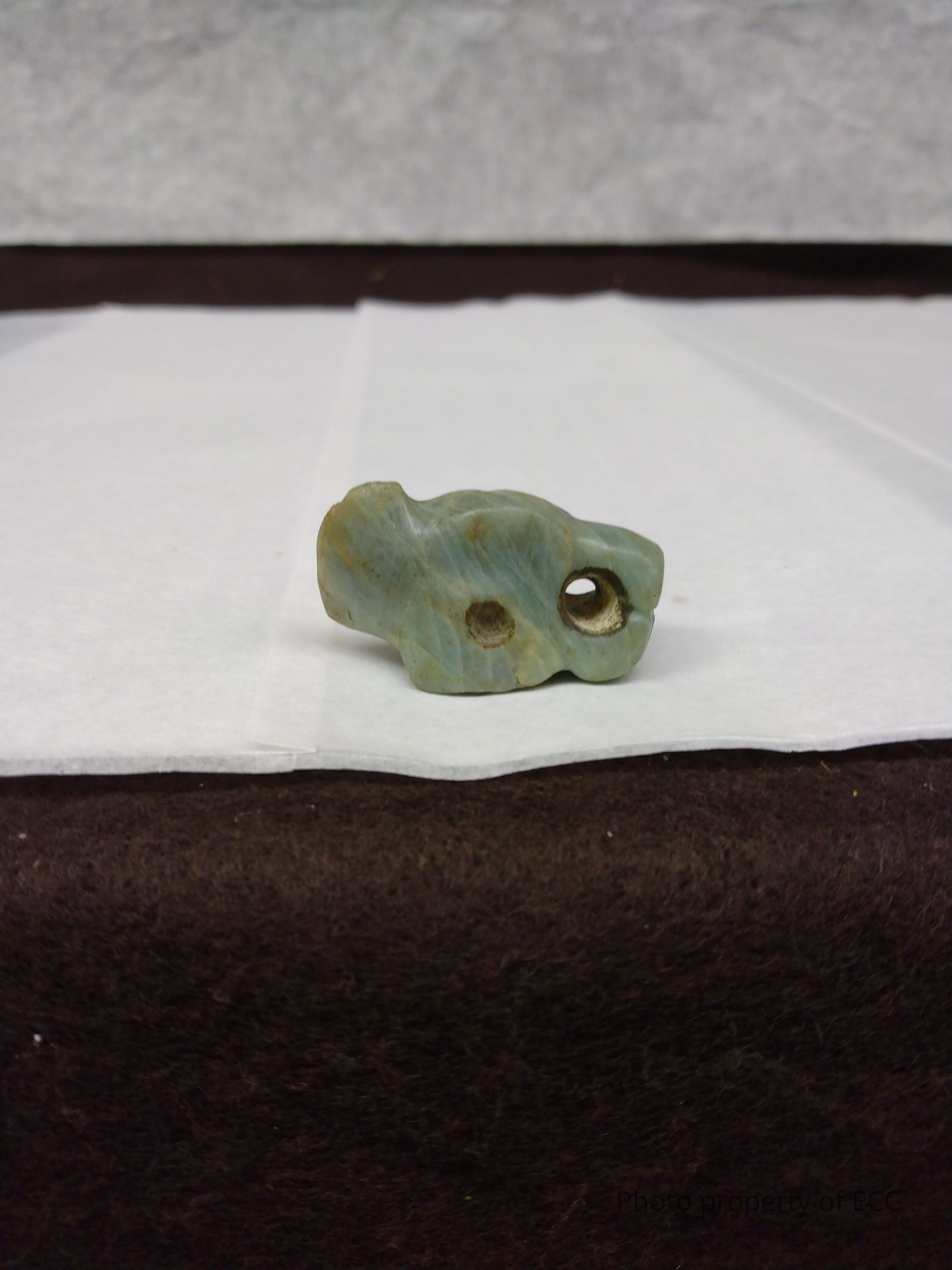 small pendant in shape of parrot head, possibly made of jade. slight discoloration in carved eye, brown residue left behind.Collection