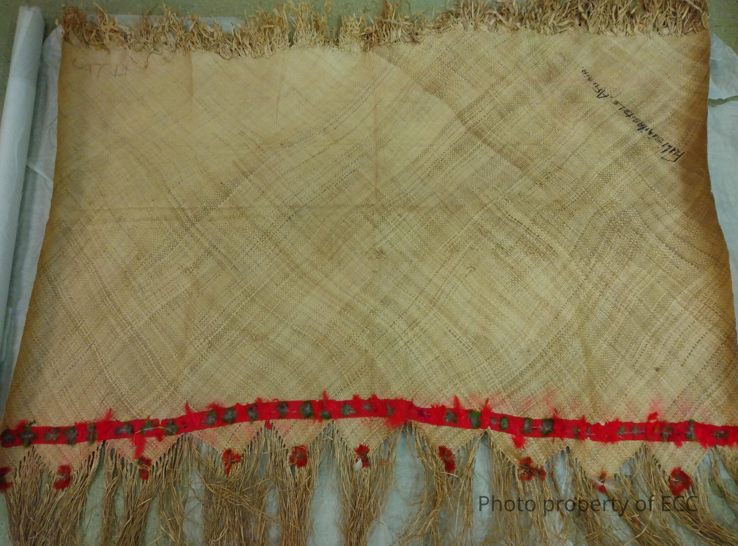 Woven palm fiber mat with straw fringe across the top, and a red strip of cloth sewn across the bottom. Grey and green fathers are sewn into the cloth. Has a triangular pattern woven on the bottom, with straw fringe hanging from the tips of the triangle. More feathers, red, are sewn into the base of the tringles. The name "Fulisiailagitele Afusia" written one on corner, with the name or word "Gau" on obverse. There is also the name or word "Latu" written at the top left corner in what looks like pencil.Use