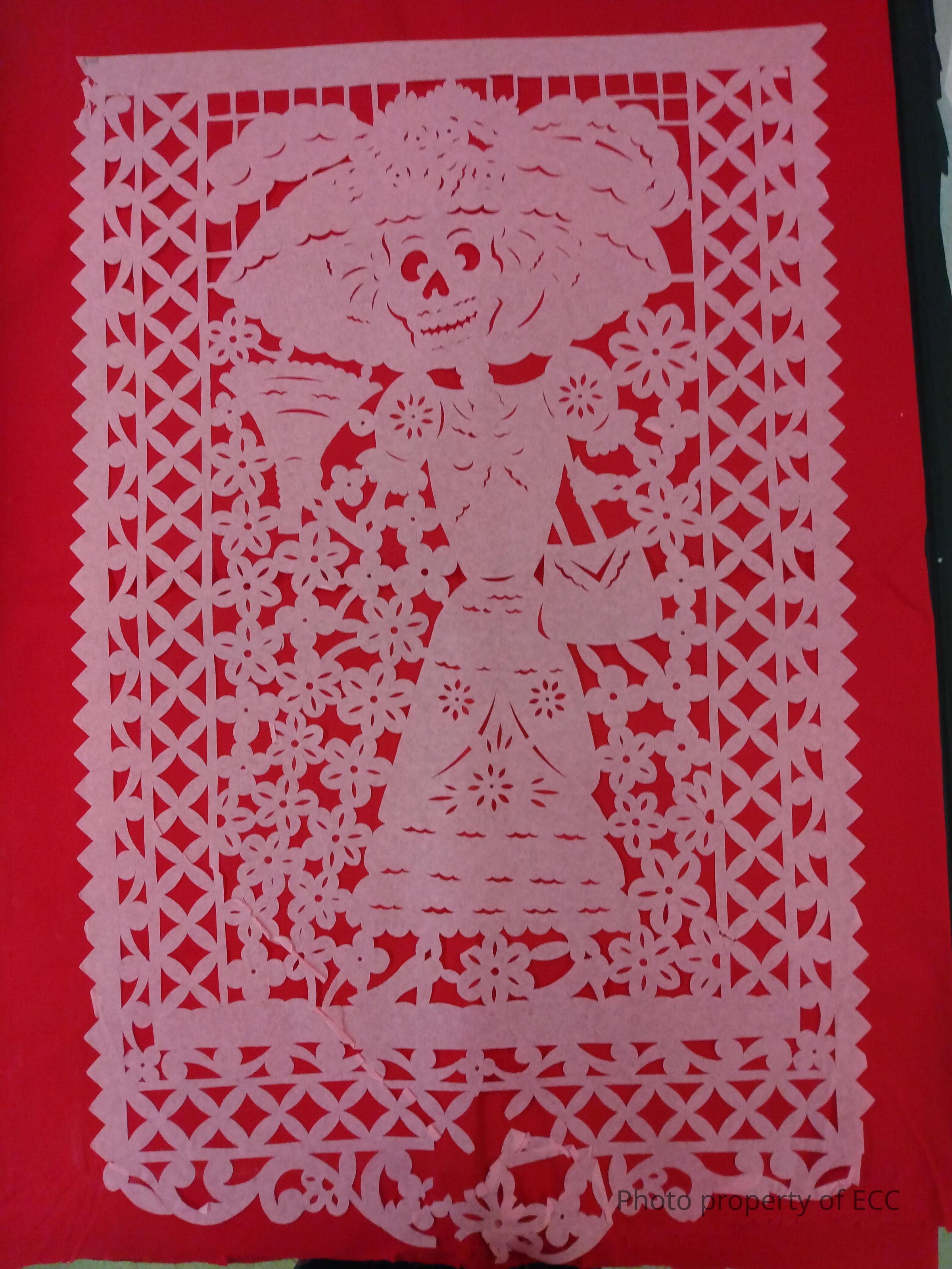 A pink papel picado of a woman in a large hat carrying a fan and purse. She is surrounded by flowers. She is a depiction of La Catrina, see the link below.Collection