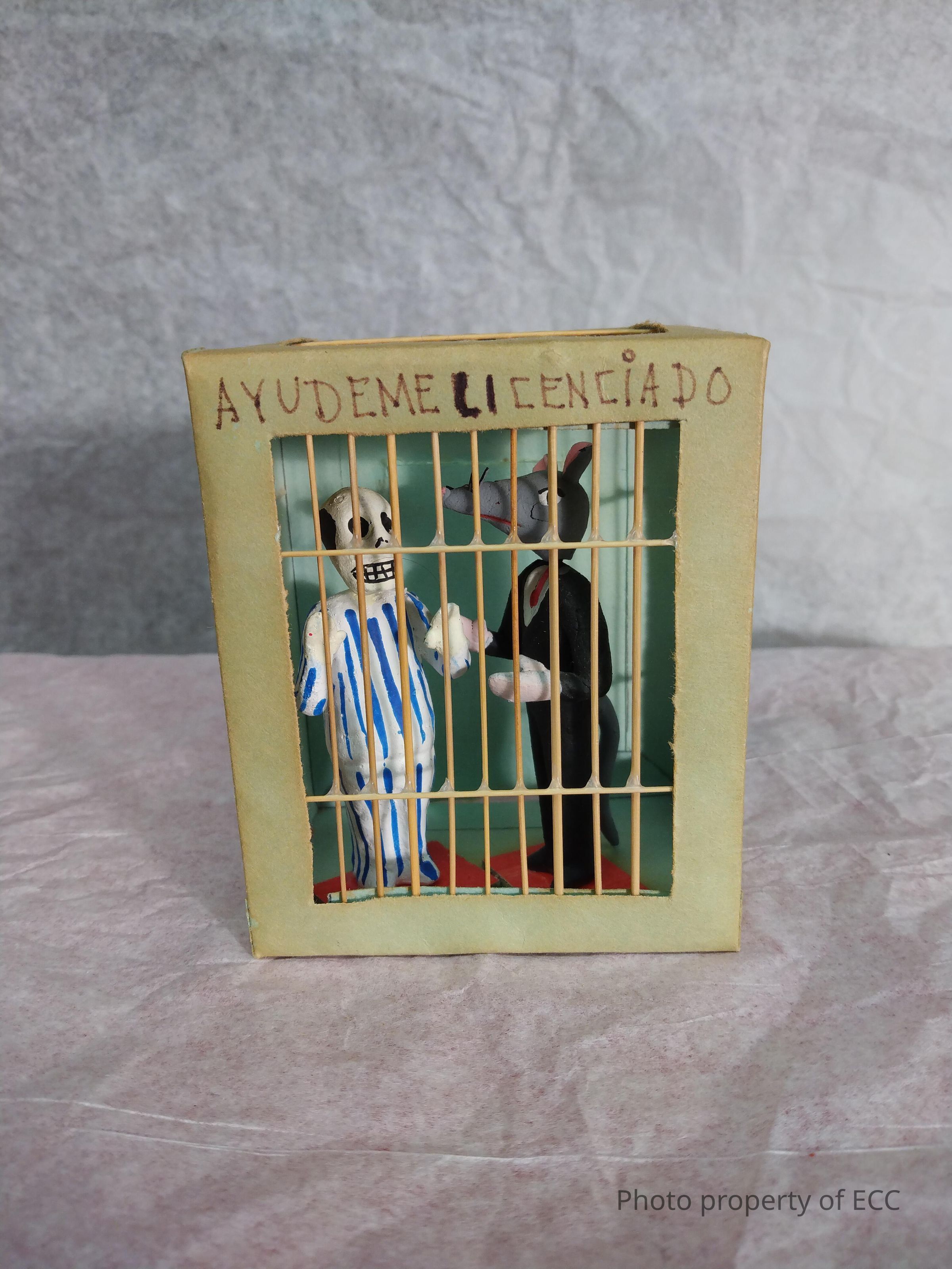 Made of clay, paper and toothpicks, this miniature of a man and rat in a jail cell has the words, "Ayudene li cenciado" written across the top. The skeleton man inside the cell wears what looks like blue and white striped pajamas, while the rat wears a black suit and red tie. The cell has a small working door on the back, with a piece of toothpick acting as a lock.Collection