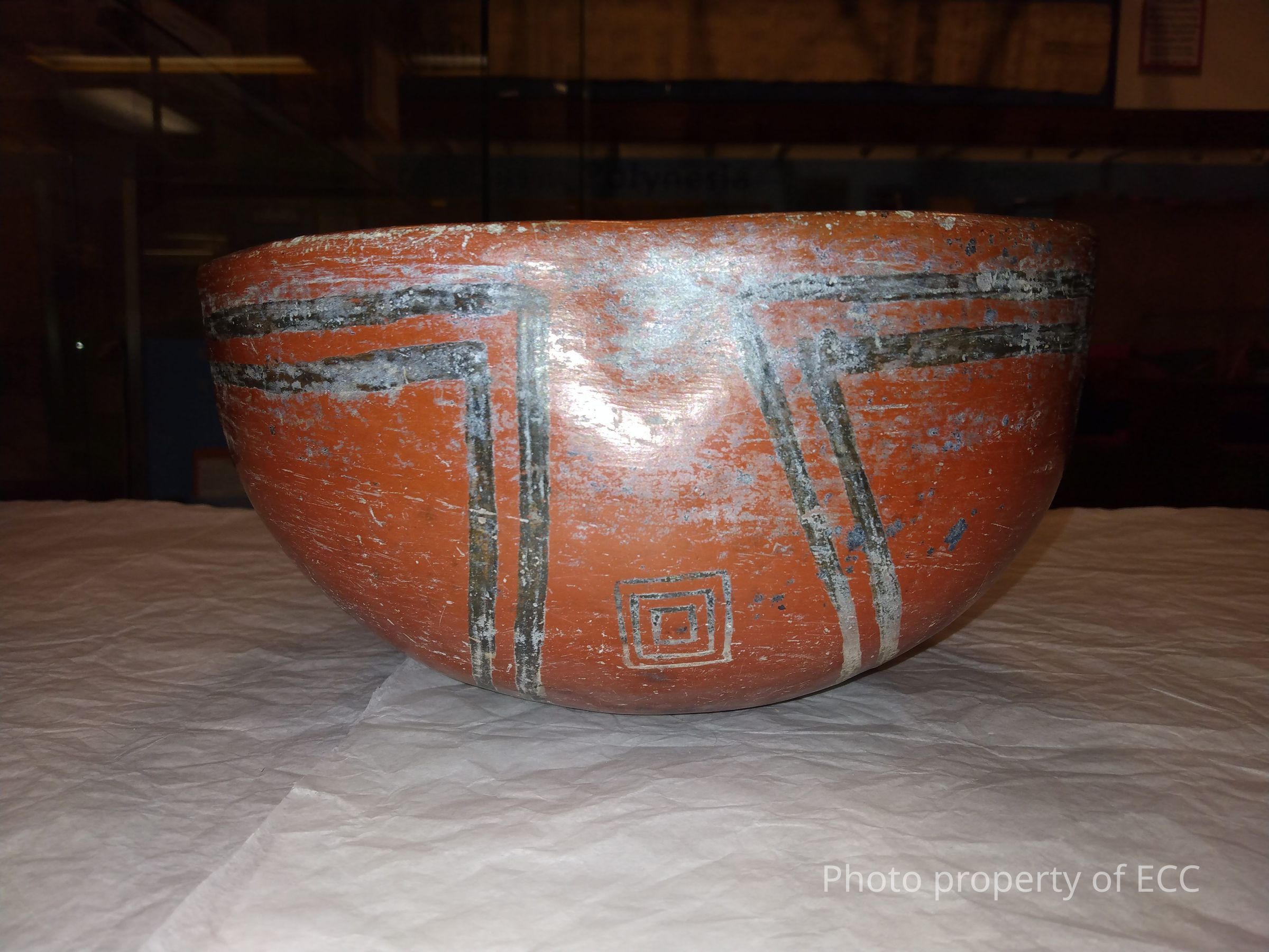 Red and black slipped polychromed bowl with indented sides. Black geometric patterns run along the sides and bottom, with a square pattern on one side. Various scrapes and weathered marks all over, with a few scattered fire clouds on the bottom. Has a small adhesive label on the bottom, labeled "A/9."Collection
