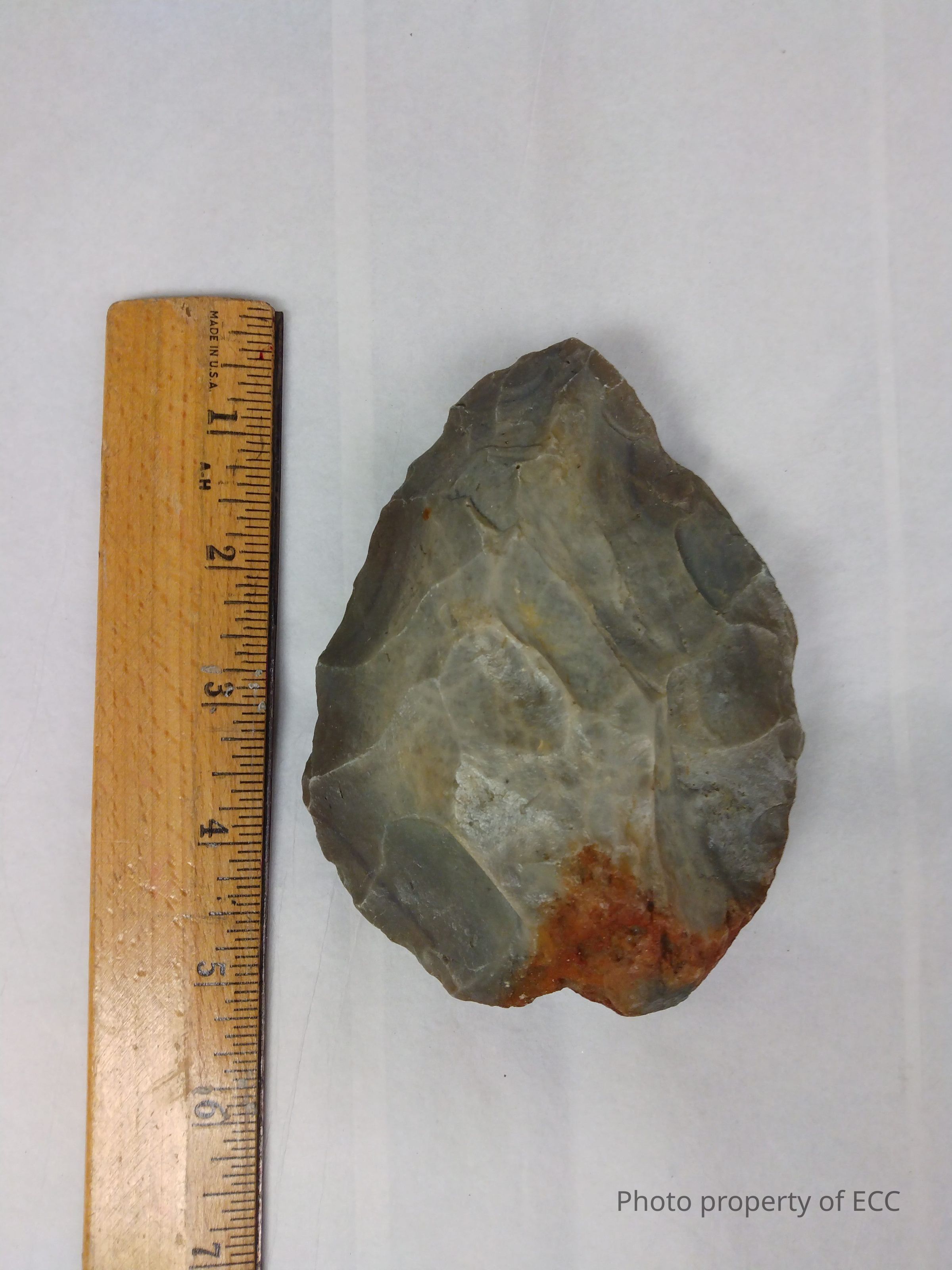 A hand axe made from an unknown rock. The edges are a dark gray color, having a sort of ombre effect becoming lighter in the center. There is some red at the base of the hand axe.Collection