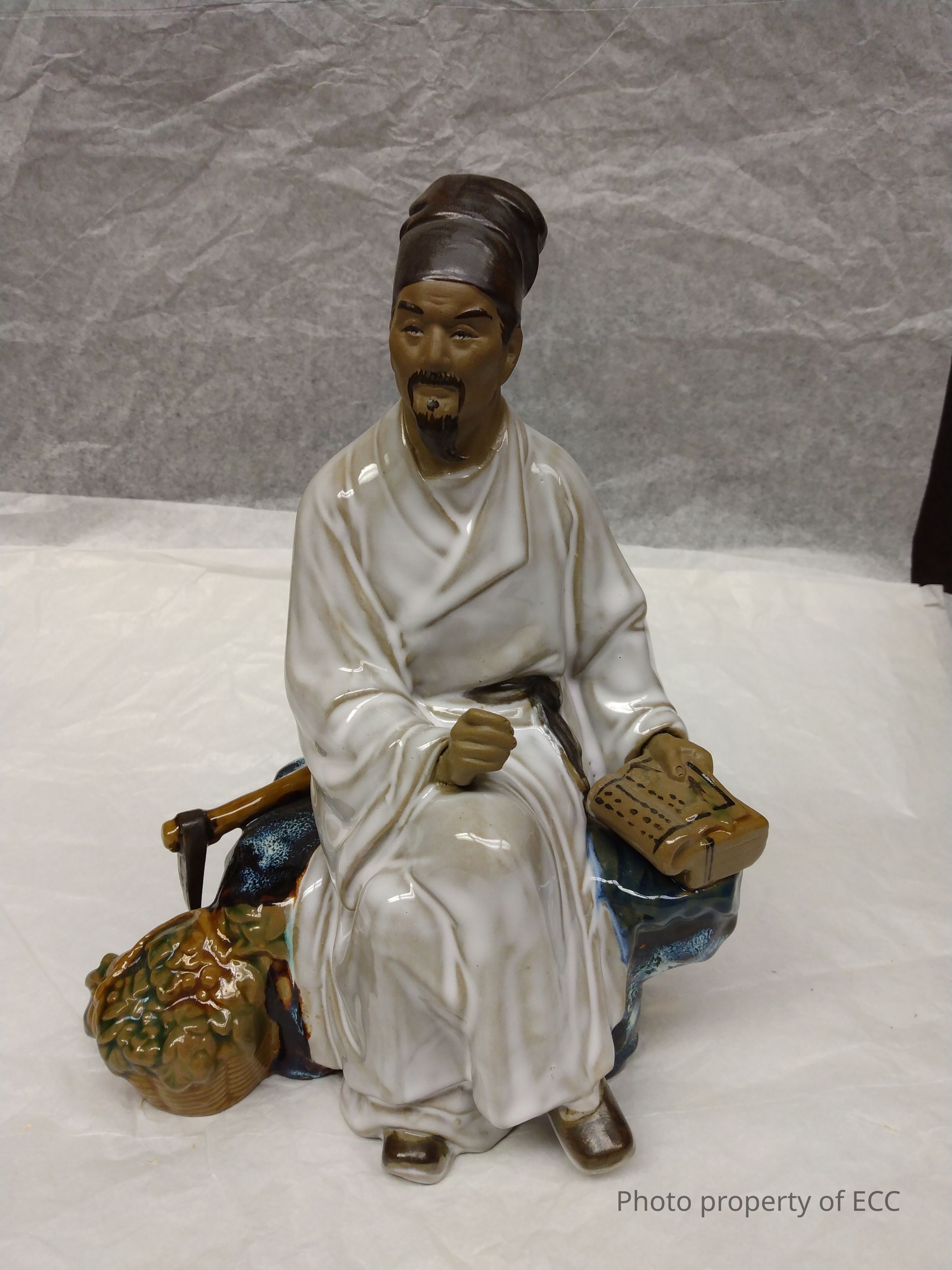 A sculpture of an Asian scribe. It is unknown if the sculpture is Chinese or Japanese. There is a basket of flowers and a pick tool by the man. He is also holding a book of parchment in one hand and was holding a pen in the other (the pen is lost). The man is sitting on a black chair. There is tape on the bottom of the sculpture.Collection