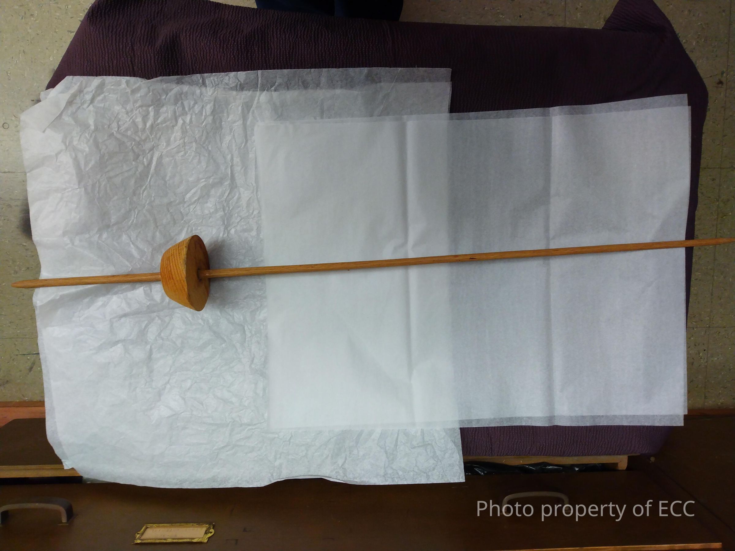 A wooden spindle that is pointed at the distal end as well as the end closer to the whorl. The whorl appears to have been attached using a hot glue gun or some other hard, clear adhesive. There are no distinctive markings or incisions.Collection