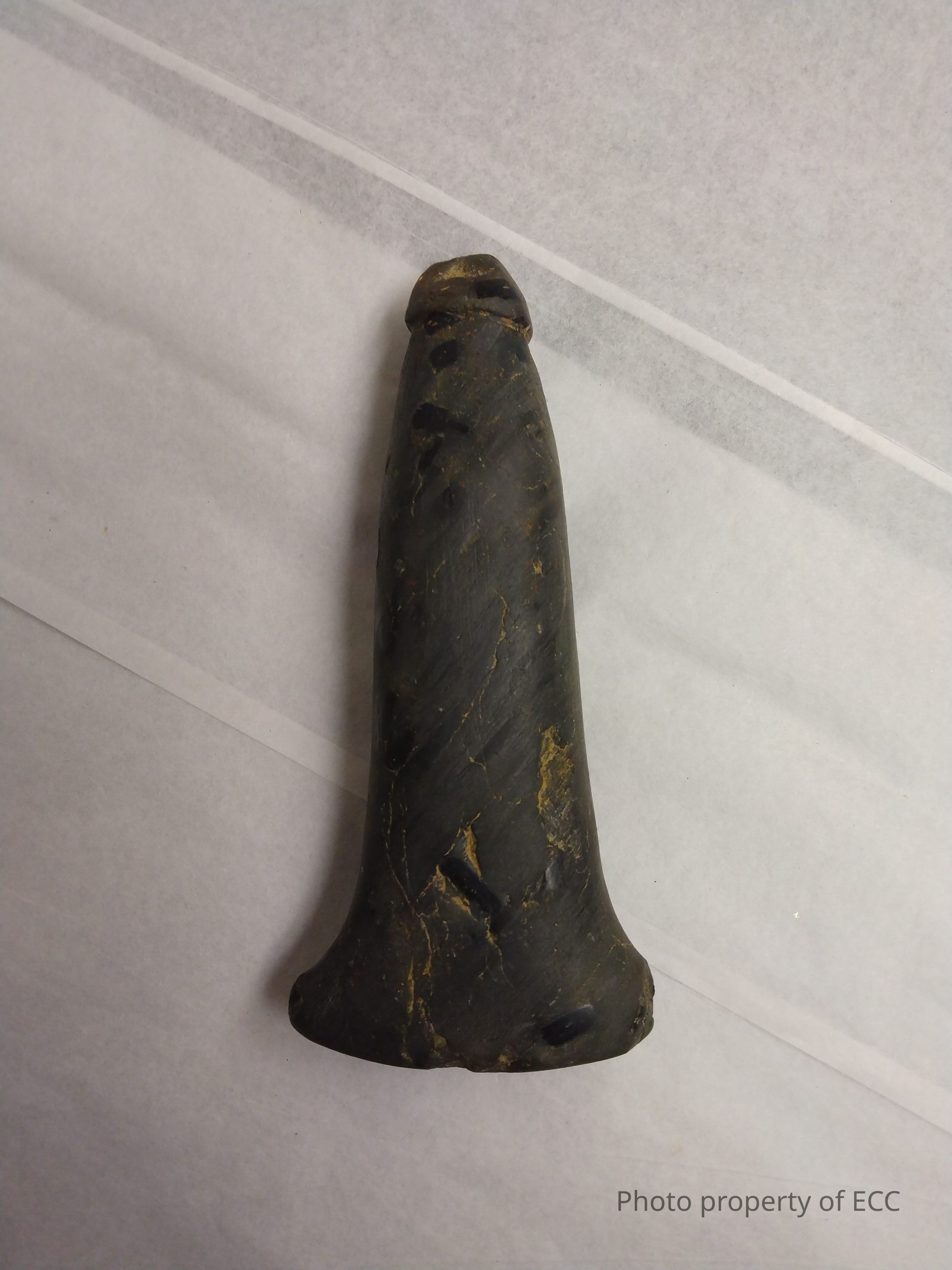 A phallus made out of black stone. Various hairline cracks throughout, probably due to age and type of material. Yellow residue in some of the deeper indentations.Collection