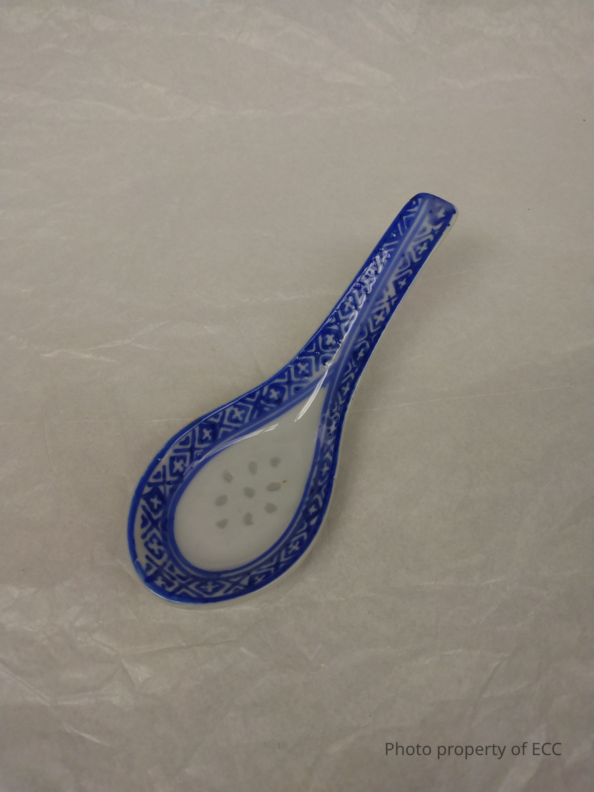 A porcelain soup spoon with blue and white geometric designs. At the center of the spoon are grey dots, possibly in a star formation. The same grey dot formation is also on the back of the spoon, along with some yellowed, hardened residue, possibly glue. "Made in China" is written in blue.Collection
