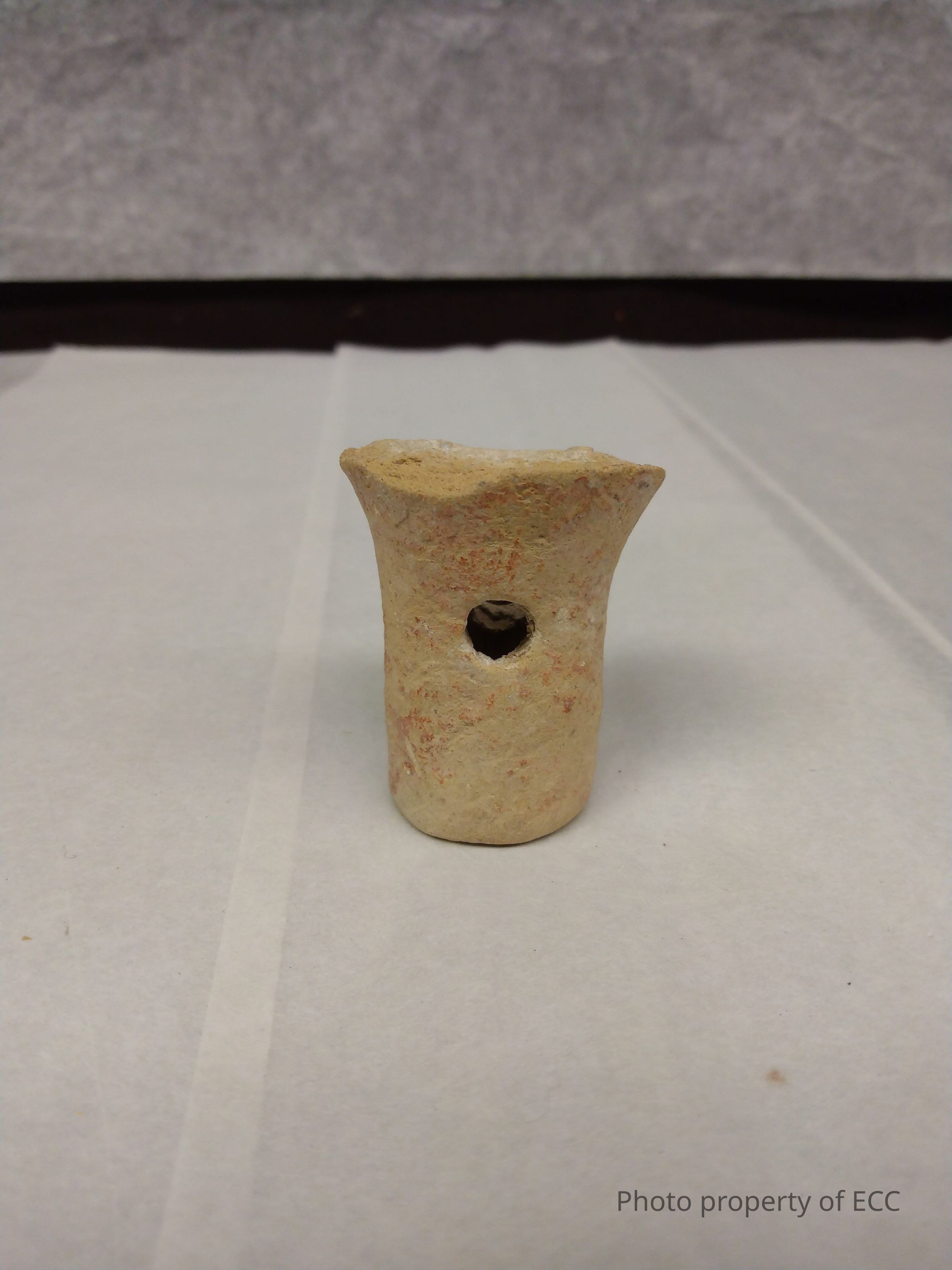 Leg from a buff bowl. Some red coloring still visible in places near the bottom. Hole in center of leg, with indented circle in center.Collection