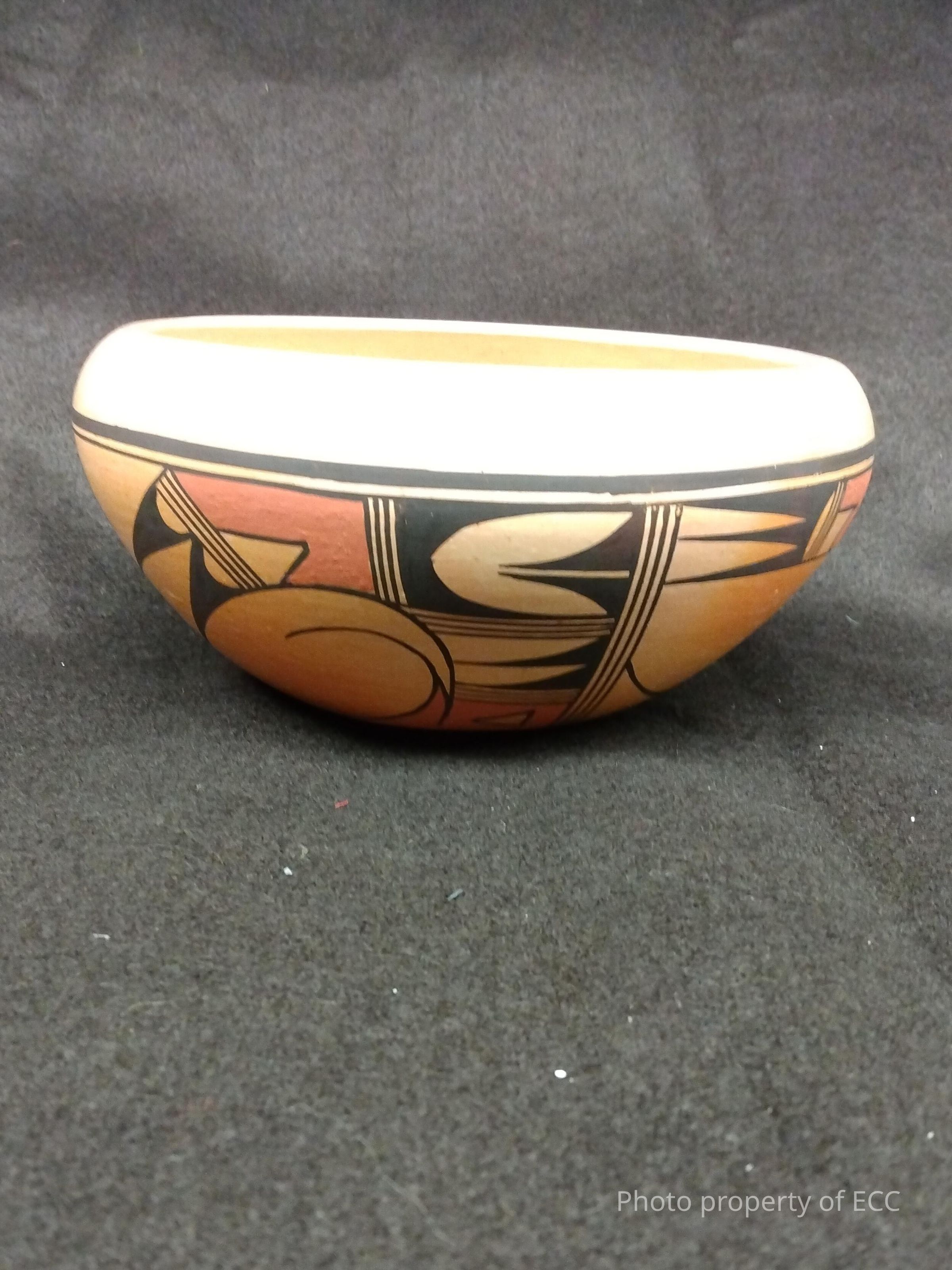 Black and red on boff scoop with painted geometric design. Potter's name on base of bowlCollection