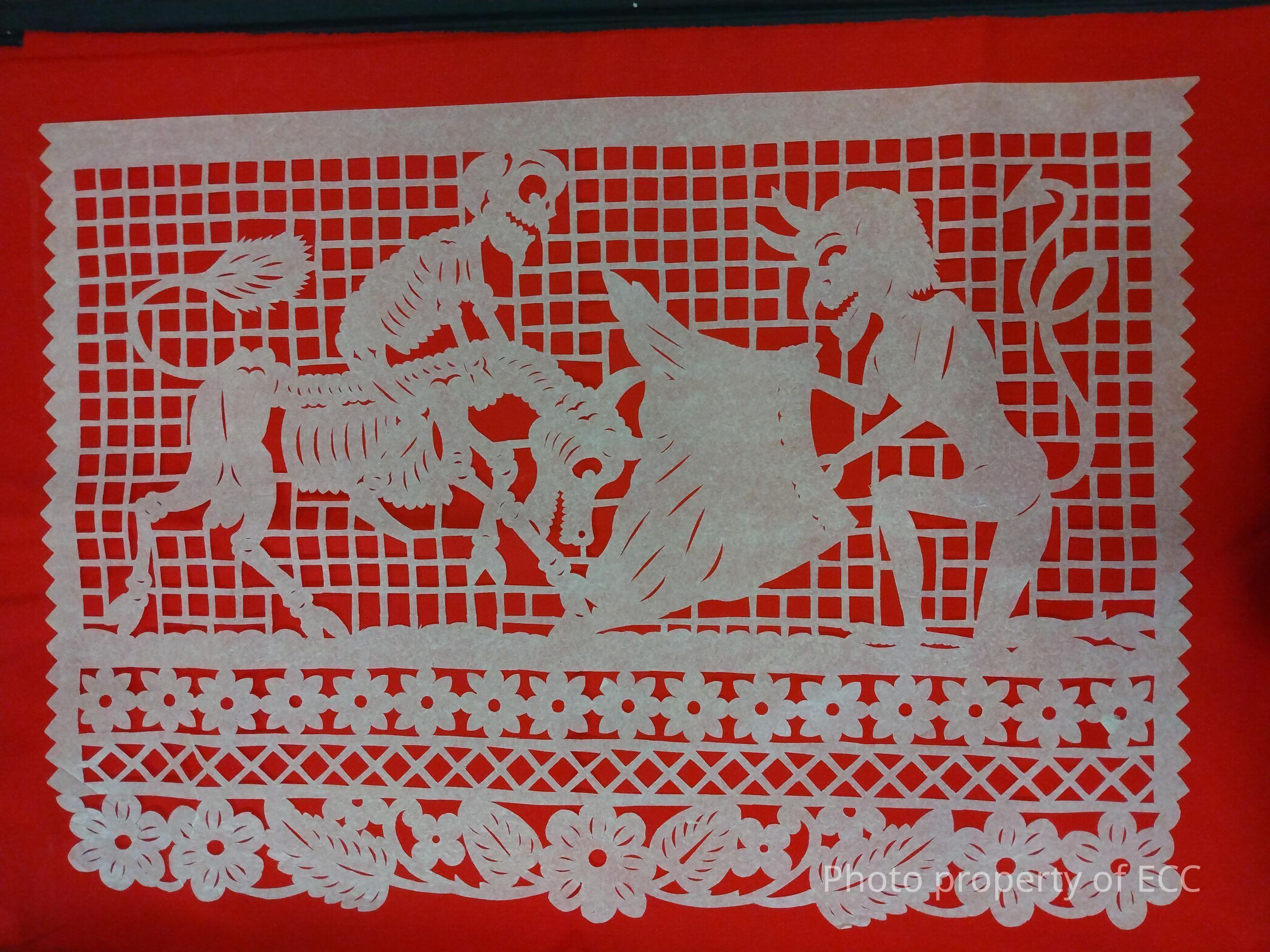 White papel picado sheet showing a devil participating in bull fighting. The bull is a skeleton with a skeleton man on top.Collection