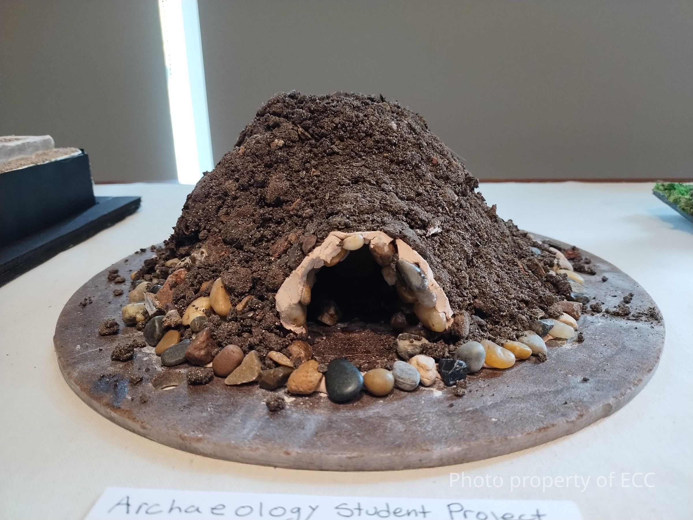 Model of a Burial Mound created by Jack Johnson for Archaeology course. The burial mound is a clay structure covered with dirt and decorated with pebbles. The mound is built on top of a circular stone plate. At the front of the mound is an entrance into the interior of the mound. The interior of the mound and the entrance is fully decorated with rocks. Inside the mound lies a clay coffin figurine.Use