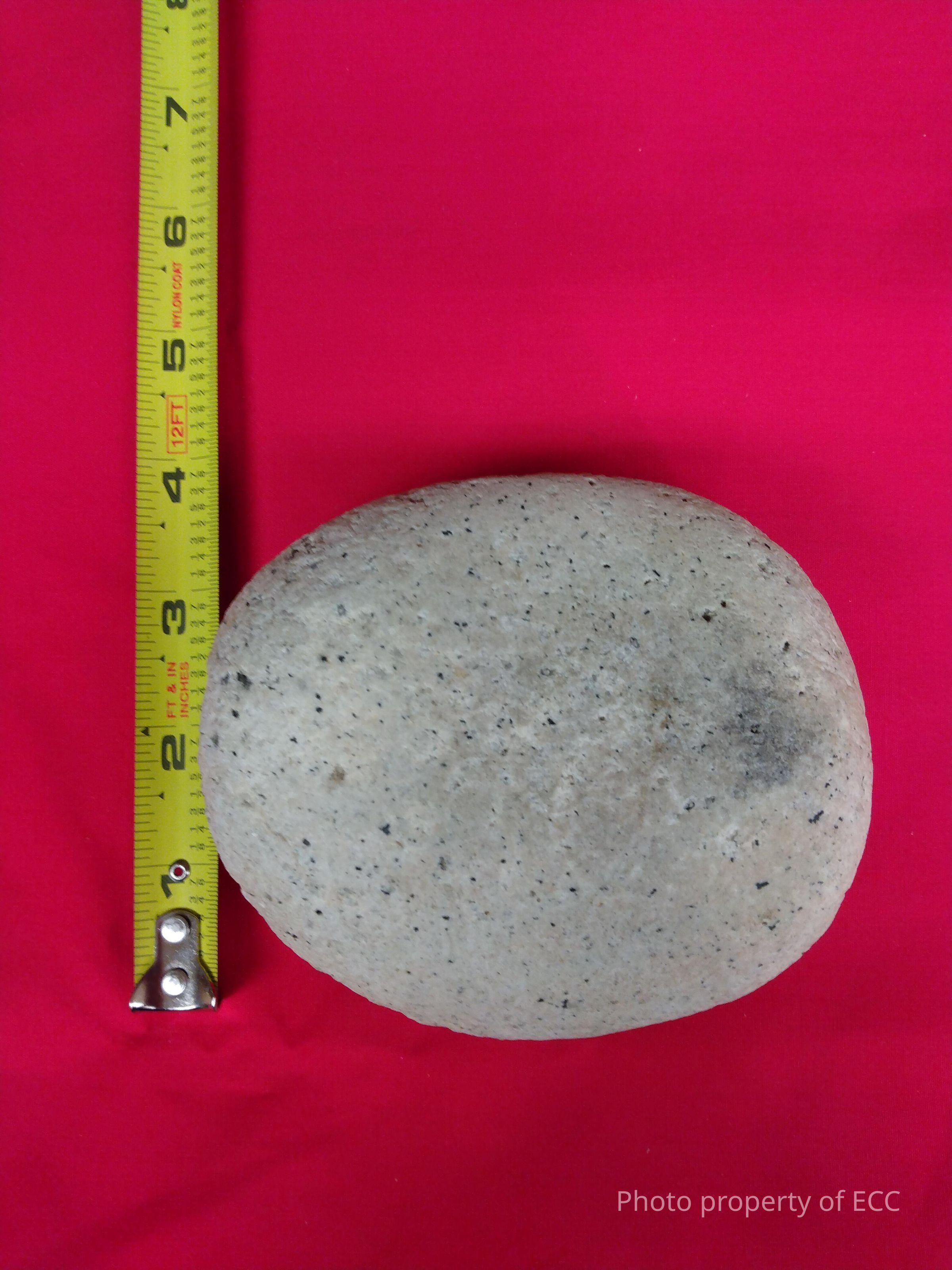 Pink quartzite mano with black speckles.Use