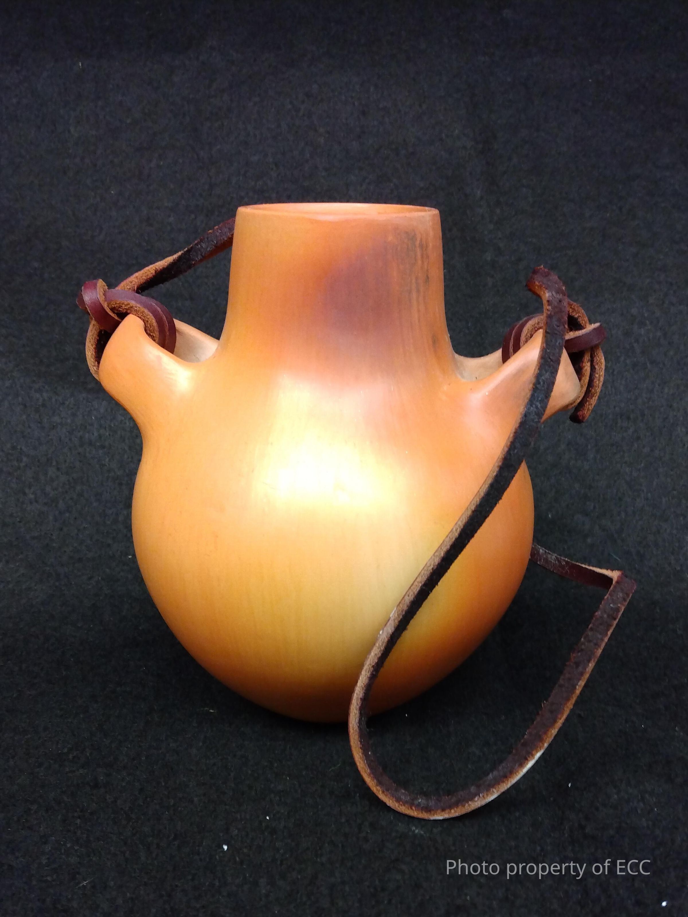 Unpainted cream color canteen with leather carrying straps. More of an orange or yellow coloring than cream.Collection
