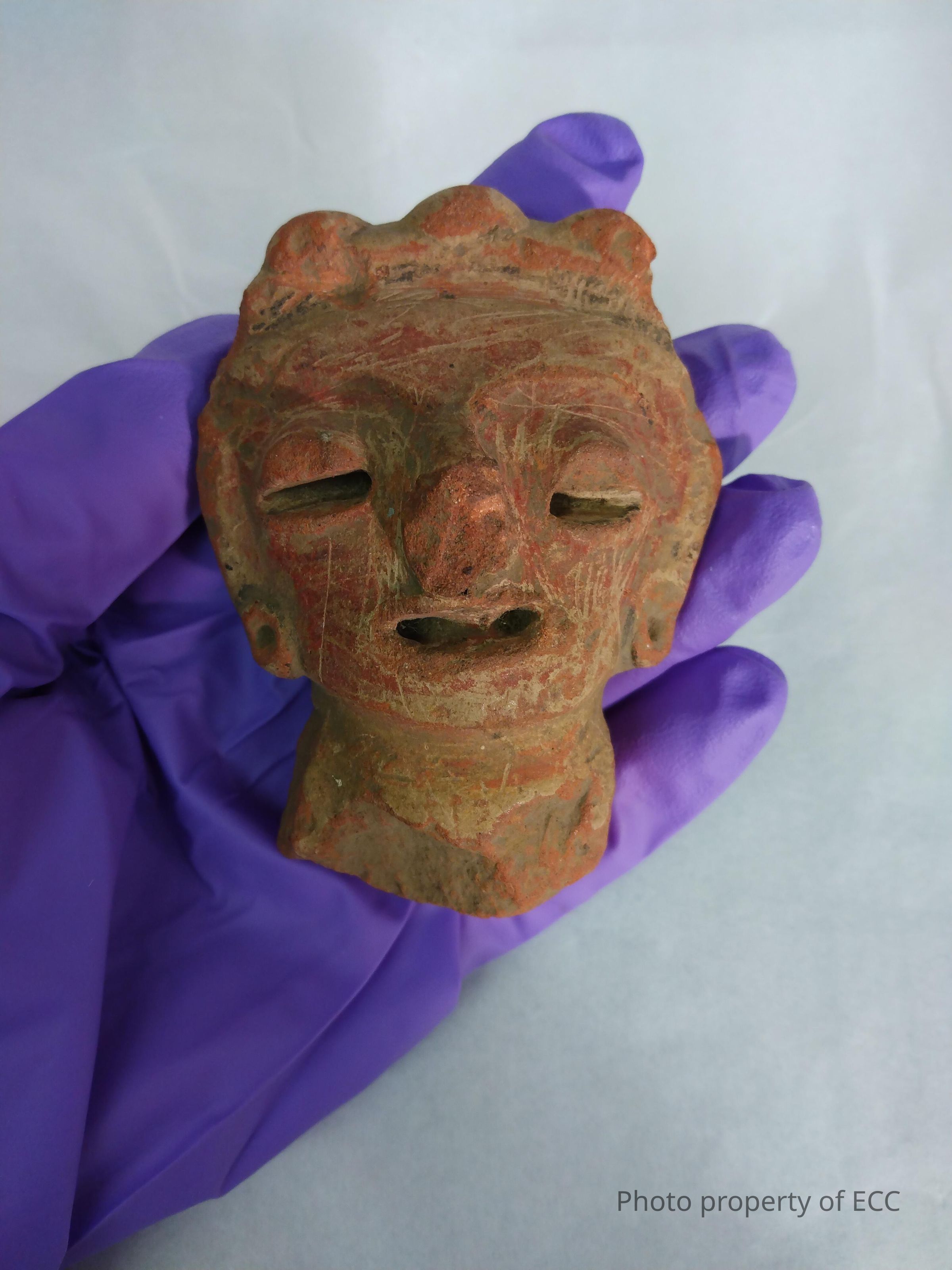 A small carved head, possibly made out of stone or ceramic. It wears a simple headpiece, evident by the three bumps on the top of the head. The ear lobes have open holes, but no decoration. Its eyes are slanted, with a slightly open mouth, possibly showing that the figure is smiling our speaking.Collection